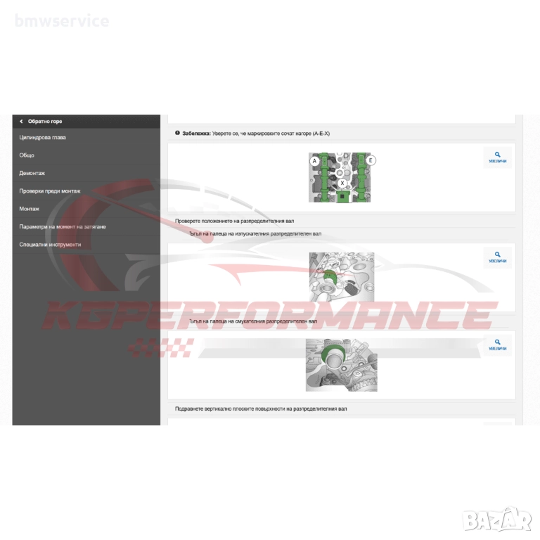 - Снимкови материали с необходимите инструменти и каталожни номера за извършване на сервизни ремонти както и време за ремонт на всеки компонент.