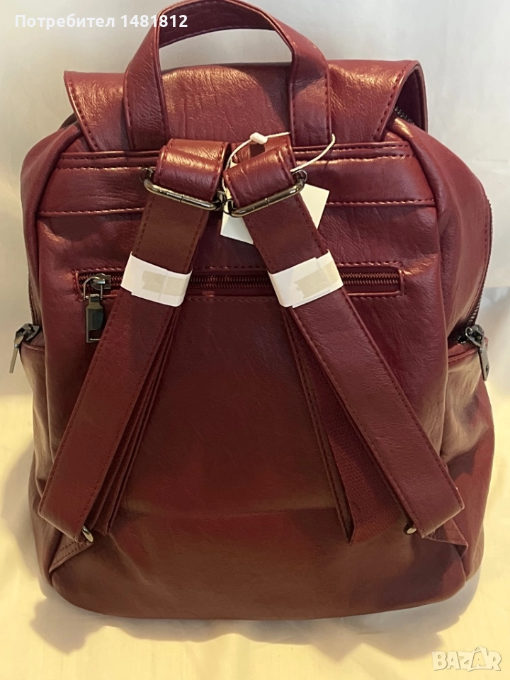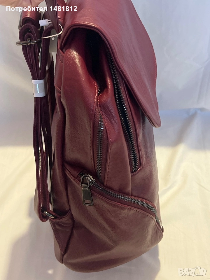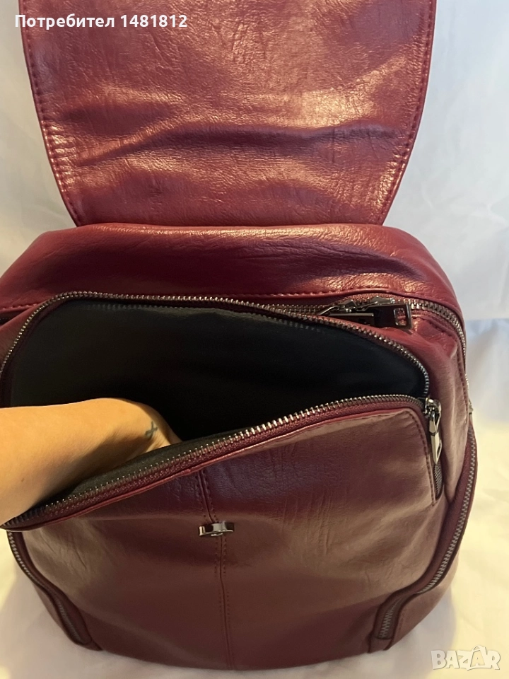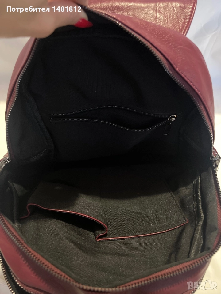 Кожена раничка в цвят бордо.2 големи прегради с вътрешни джобове,задно отделение и странични с ципове.Размери 33см х 33см