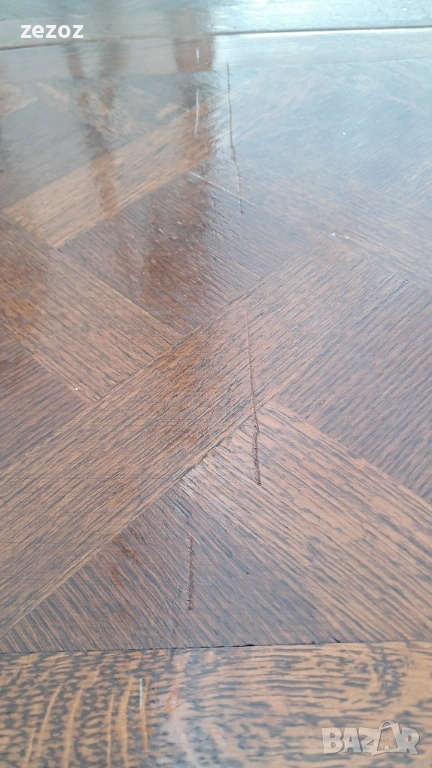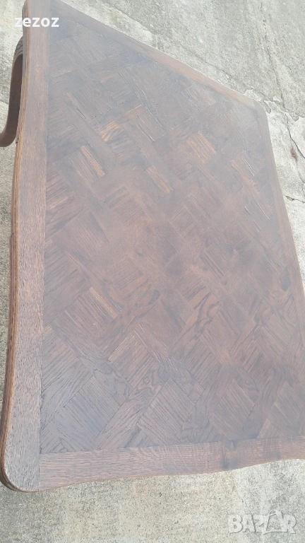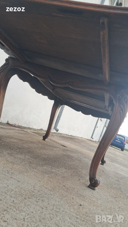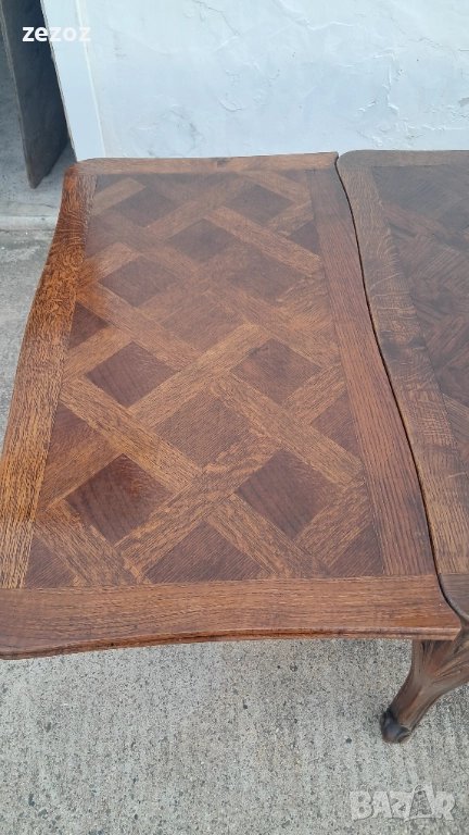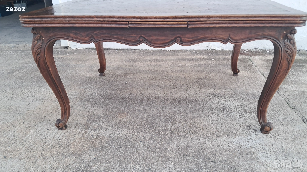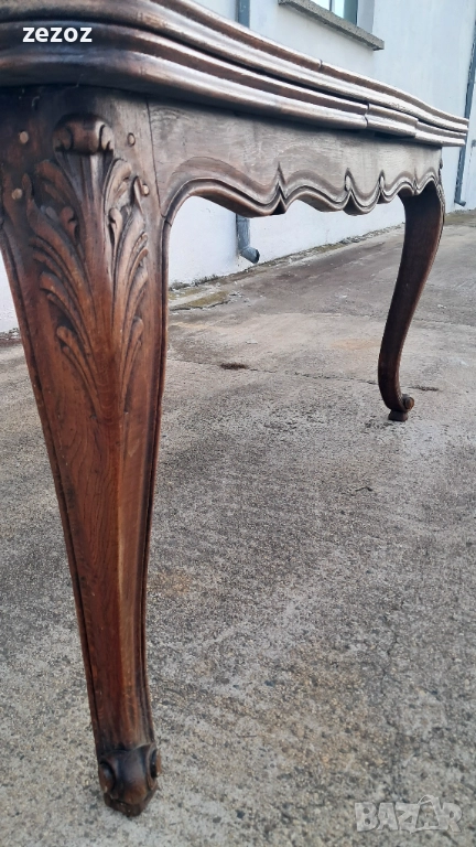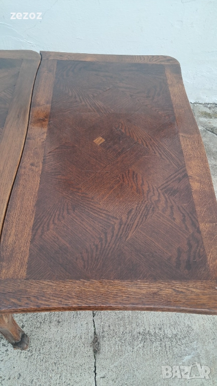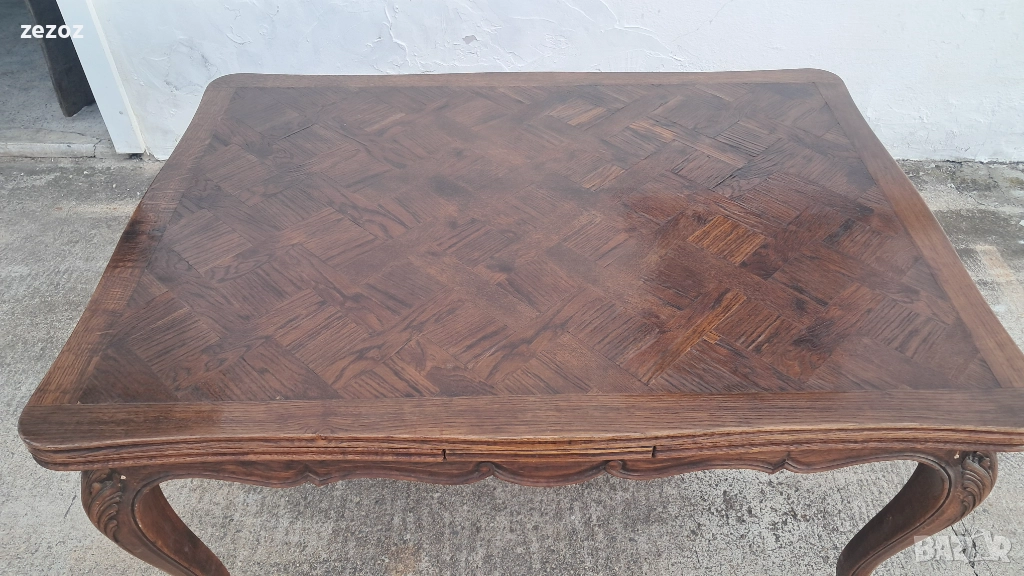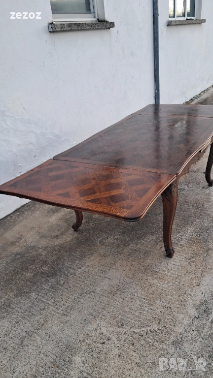 Антикварна разтегателна трапезна маса,в стил "френски прованс" или Луи 15.Дъбов масив.Масата е голяма в разтегнато положение.Плот покрит с техника "паркетри"-паркртен под.Характерните за стила "кабриолни"крака.Разтяга се с две допълнителни крила.Леки забележки видими на снимките.Размери-