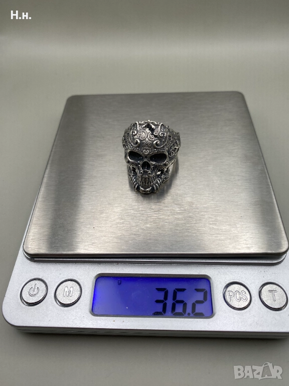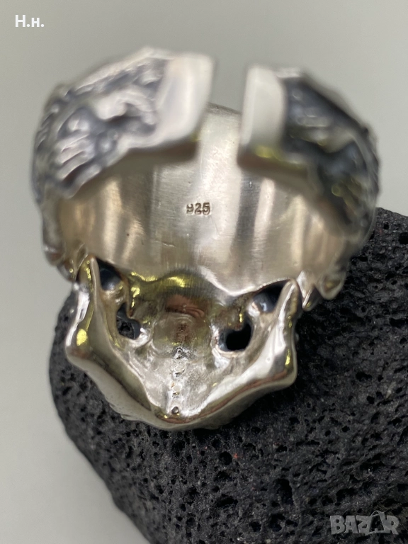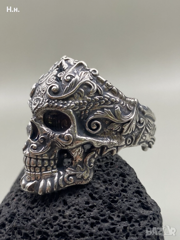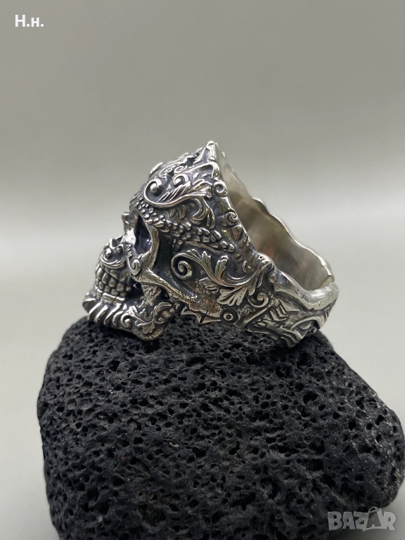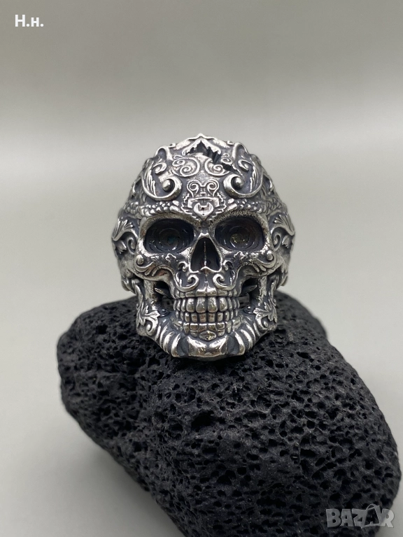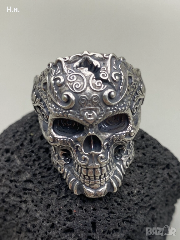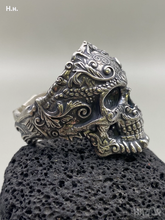 Уникален ръчно изработен пръстен от сребро 925, представящ стилизиран череп, обвит в фини барокови орнаменти и гравюри. Символизира сила, безстрашие и вечността – перфектен избор за хора със собствен стил и характер.