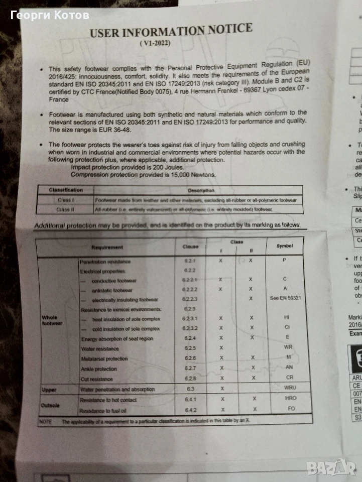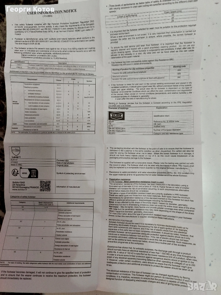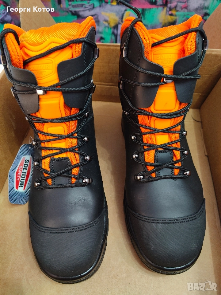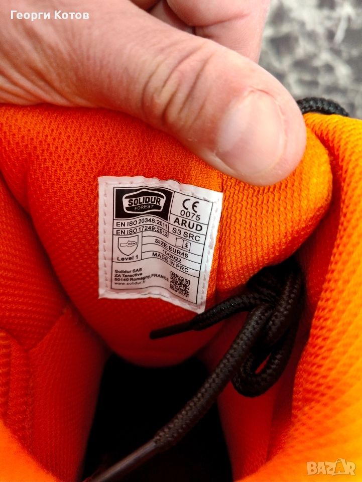 Марка: Solidur Forest Сертификати за безопасност: EN ISO 20345:2011, EN ISO 17249:2013, S3 SRC Ниво на защита: Ниво 1 Размер: EUR 45 Описание ARUD е предпазна обувка за ръчна работа с верижен трион клас 1 (20 м/с). Тя е с полиуретанова подметка с двойна плътност и стоманена междинна подметка против перфорация. Тази висококачествена обувка се отличава с дишаща мрежеста подплата и 2 мм водоотблъскваща горна част от кожа. Здрава и издръжлива, включва TPU бомбе и XL устойчиво на корозия стоманено бомбе. Основни предимства Състав: Горна част от 2 мм кожа с водоотблъскваща обработка, TPU бомбе с устойчиви на износване шевове, XL стоманено бомбе с корозионно-устойчива обработка, полиуретанова подметка с двойна плътност с противоплъзгаща и устойчива на пробиване стоманена подметка. Оптимална защита: Устойчивост на срязване с клас 1 защита от верижен трион и повишена безопасност благодарение на противоплъзгаща и устойчива на пробиване полиуретанова подметка с двойна плътност. Допълнителна информация Индустрия (занаяти): Обувките ARUD са проектирани да отговорят на нуждите на професионалисти в