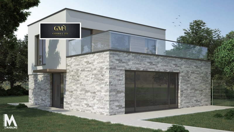 Къщата е проектирана в съвременен архитектурен стил с елегантна фасада, съчетаваща декоративна каменна облицовка и изчистени геометрични линии. Панорамните прозорци осигуряват максимално естествено осветление и връзка с околната среда. На втория етаж е разположена просторна тераса с модерно стъклено ограждение, предлагаща чудесна гледка и възможност за зона за отдих на открито.