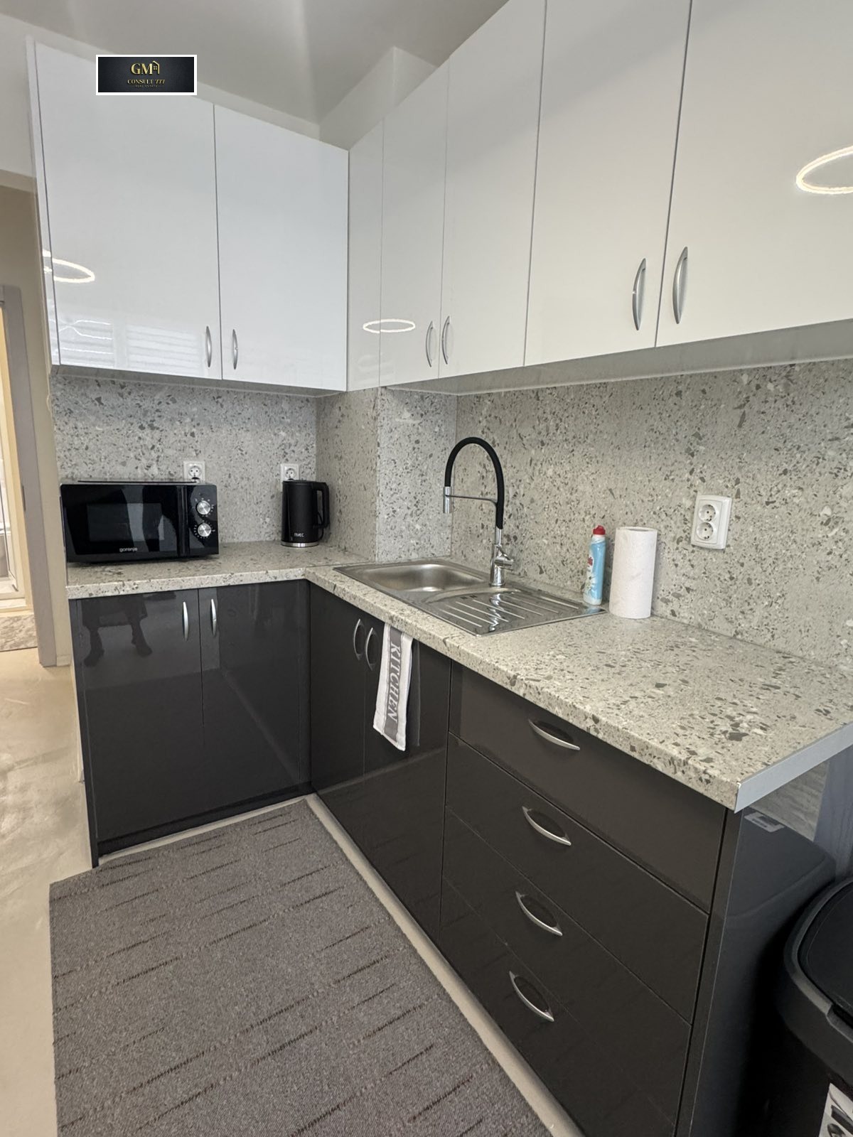 Кухнята е модерна и отлично организирана, оборудвана с всички необходими електроуреди за едно домакинство. Кухненската зона плавно преминава в уютна трапезария, а след това - в отделна уютна дневна, което прави пространството практично и приятно за ежедневие или събирания.