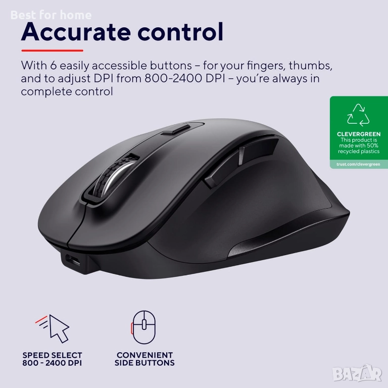 Регулируема чувствителност (DPI): Възможност за настройка на скоростта на курсора (800/1200/1600 DPI) с един бутон.