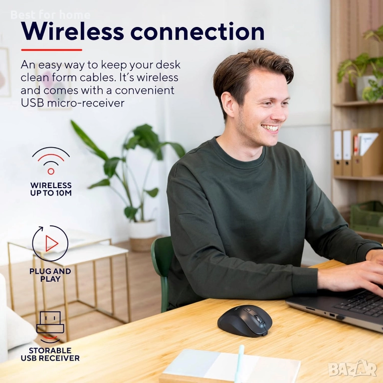 Безжична свобода: Свързва се чрез малък USB приемник (Plug & Play) с обхват до 10 метра.