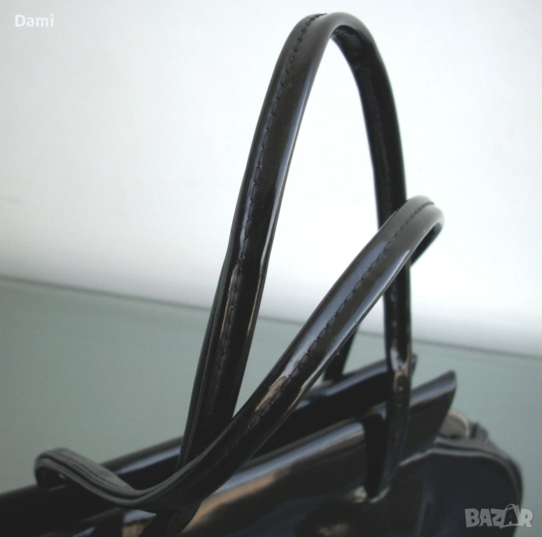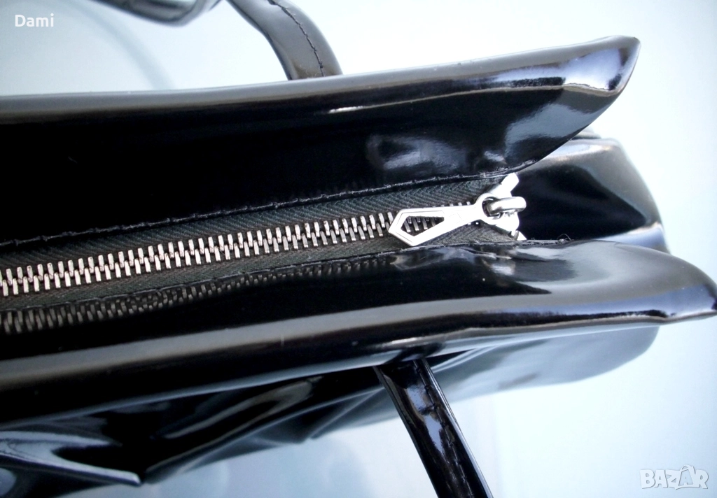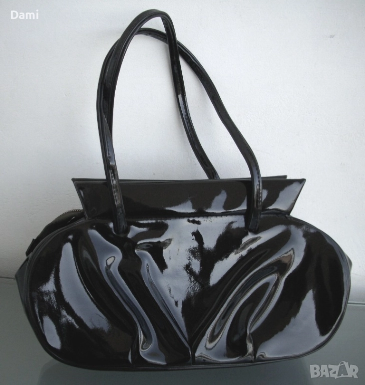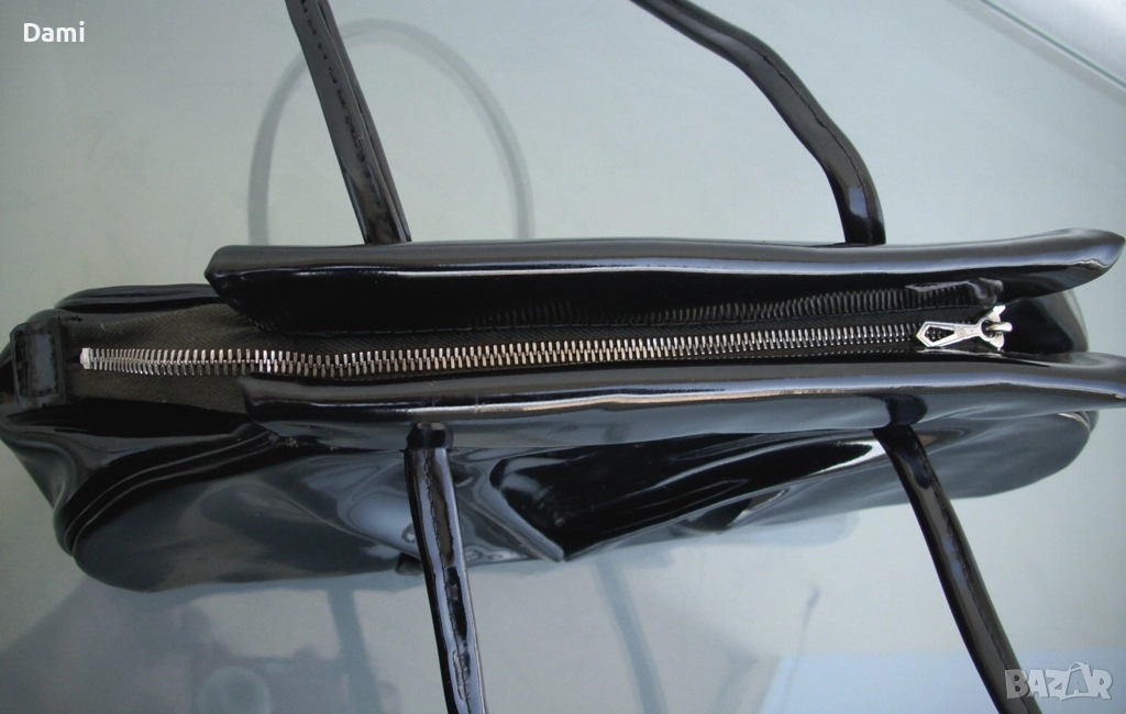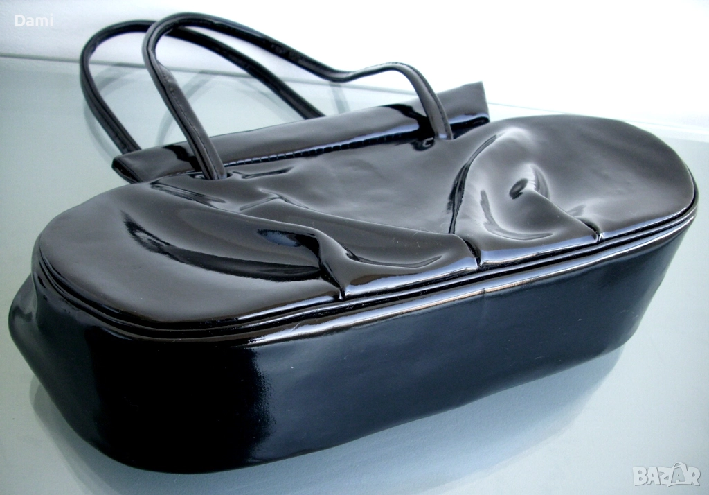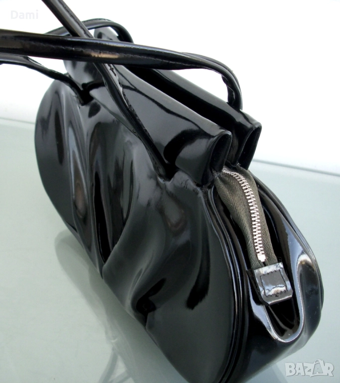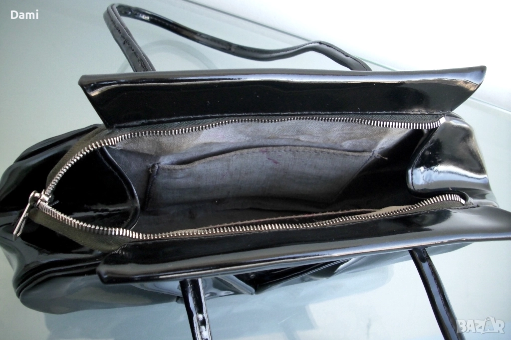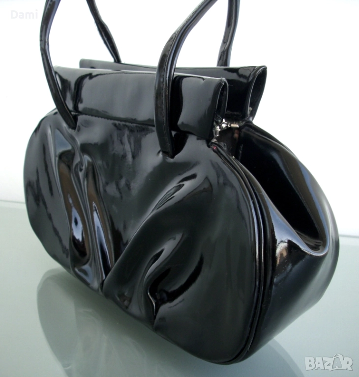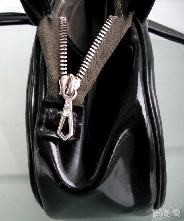 Дамска вечерна чанта от 20-30-те години на миналия век, предвоенно производство. Елегантен дизайн. Изработена от качествена изкуствена кожа черен лак, с твърдо дъно, подплатата е от текстил с два малки джоба. Ципът работи безупречно, като нов. Чантата е отлично запазена, лаковото покритие е перфектно, без повреди, дръжките са здрави. Подплатата е напълно здрава, с леки замърсявания от употреба. Размери 28Х16 см, ширина на дъното 6 см, дължина на дръжките 45 см.