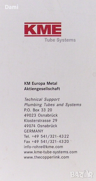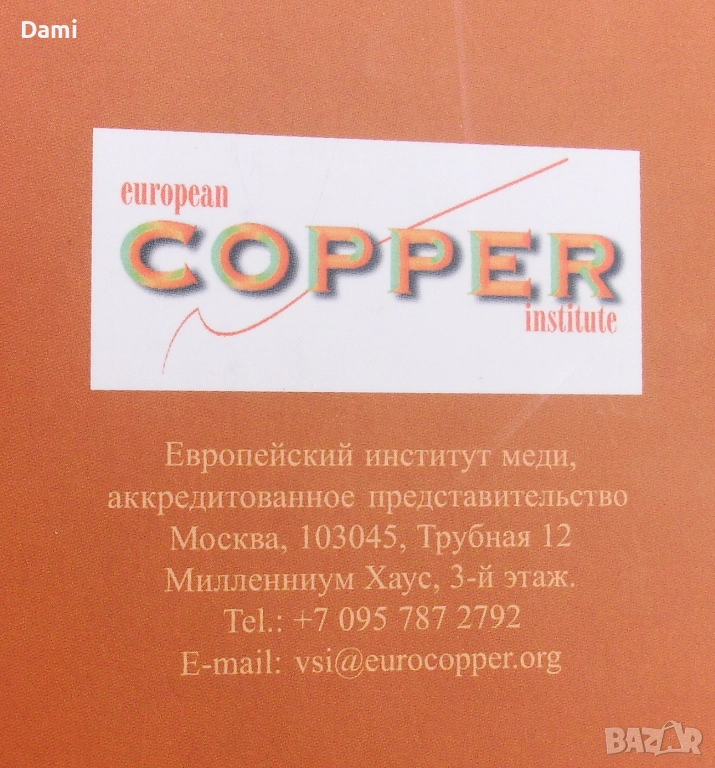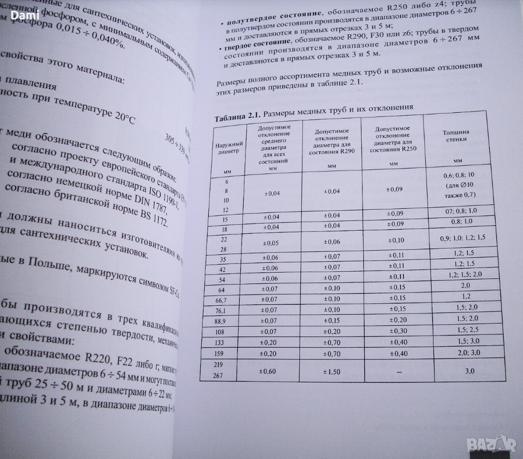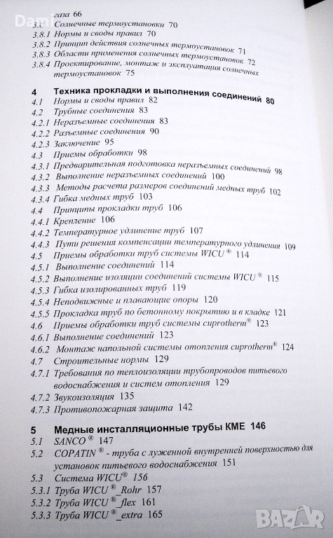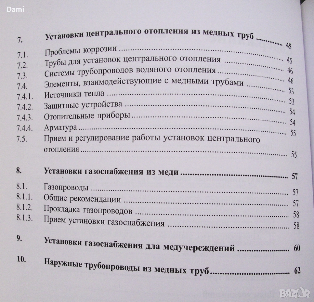 2. Медь в санитарно-технических установках, Гражина Бартолд -Вишневска, Издателство за учебна и педагогическа литература, Варшава, с подкрепата на European Copper Institute, 1997, руски език, мека корица, 68 страници. Размери 165 х 235 х 6 мм. В книгата са разгледани преимуществата на медните инсталации с обзор на техните елементи, представени са обработката и съединяването на медните тръби. Особено внимание е отделено на технологичното изпълнение на водопроводните, отоплителните и газовите инсталации, както и на външните подземни медни тръбопроводи с много схеми и помощни таблици. Книгата е нова, неупотребявана, неразлиствана. Цена 60 €.