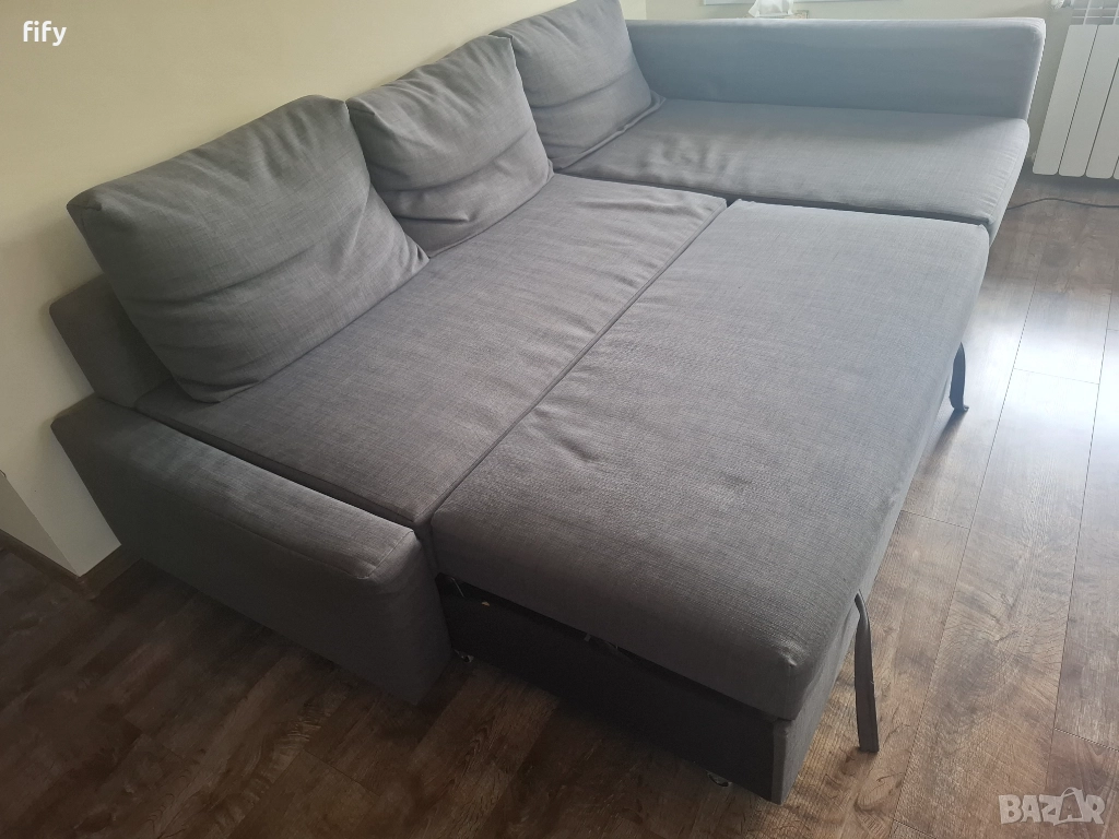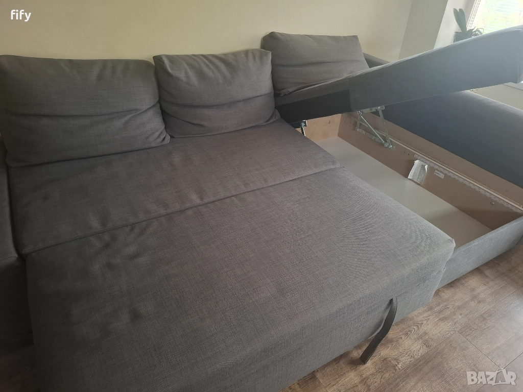 Удобен и практичен разтегателен диван от серията FRIHETEN.Има лека амортизация на възглавниците и дунапрена,но е запазен,без петна и скъсано.Има два дефекта,виждат се на снимките.За района на София.