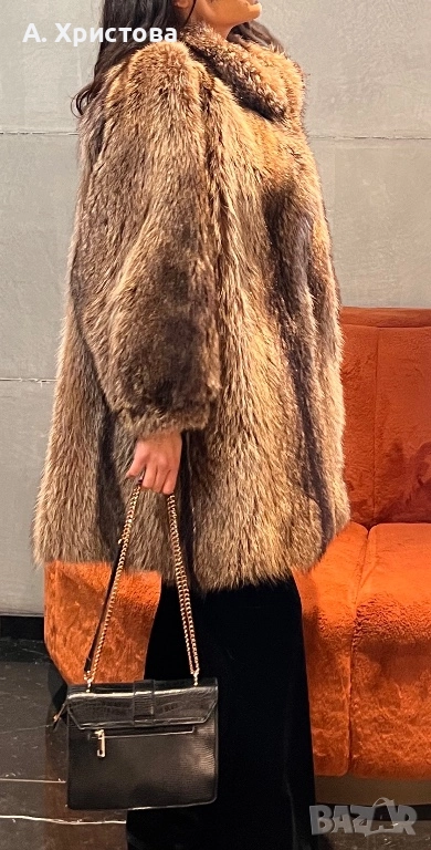 Луксозно дамско палто от висококачествен естествен косъм, отличаващо се с плътност, мекота и изискан естествен блясък. Моделът е с класическа, свободна линия, която пада свободно и пази топло.