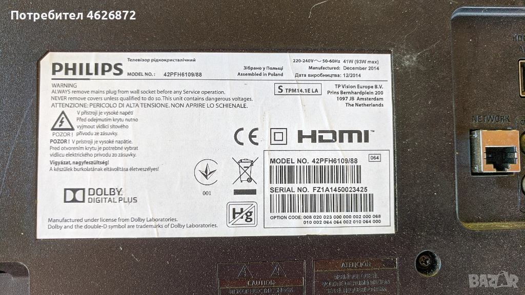 PHILIPS 42PFH6109/88-715G6165-M02-000-005N-715G6169-P01-W22-002H-V14 42 DRD TM120 Control _Ver 6870C → Обява 52979536