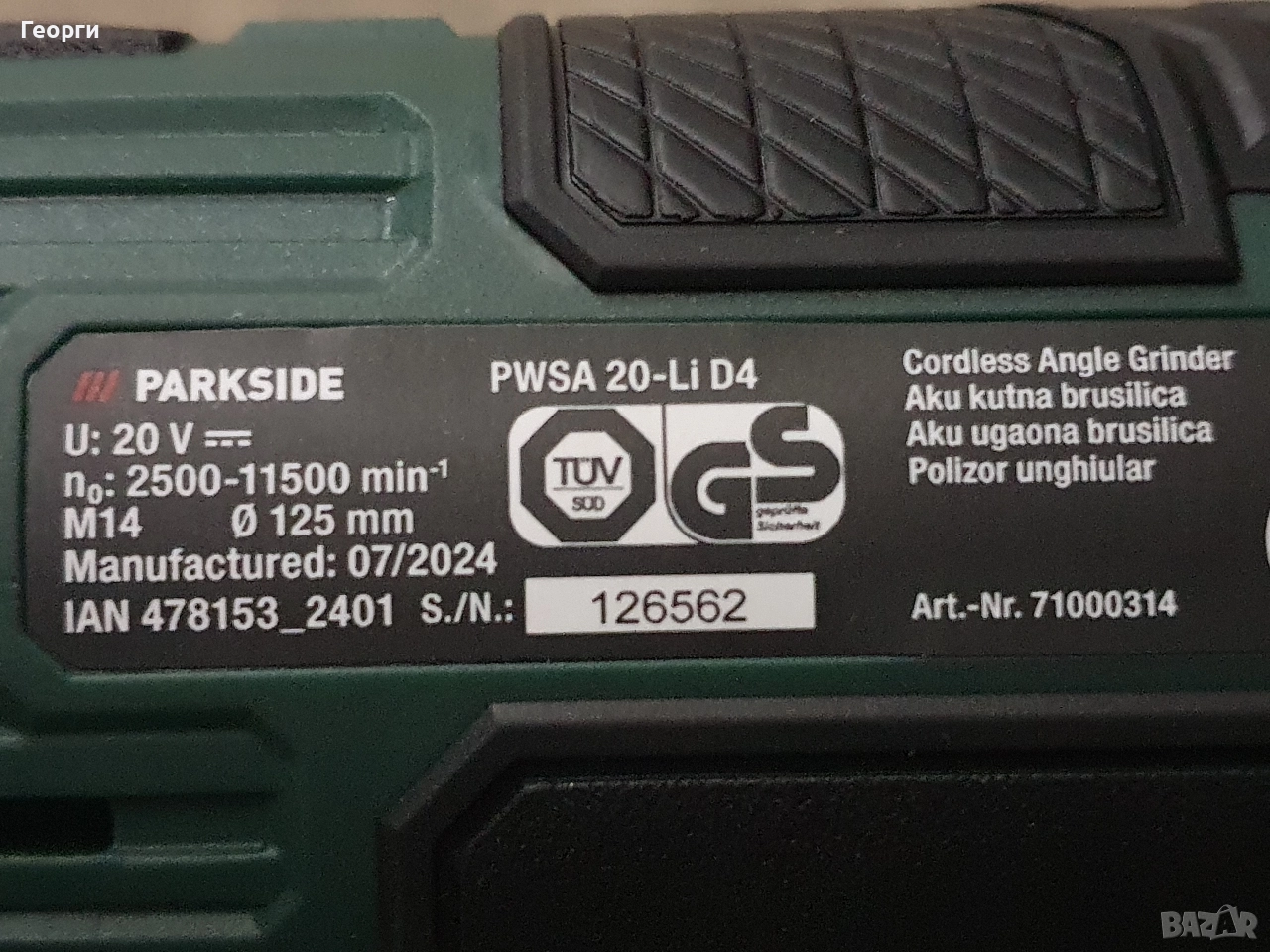Акумулаторен ъглошлайф Parkside PWSA 20-Li D4 → Обява 52979577