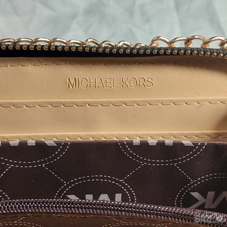 Michael Kors. Конкретният модел е черен на цвят със златист цип, голямо златисто лого "МК" отпред и верижка.