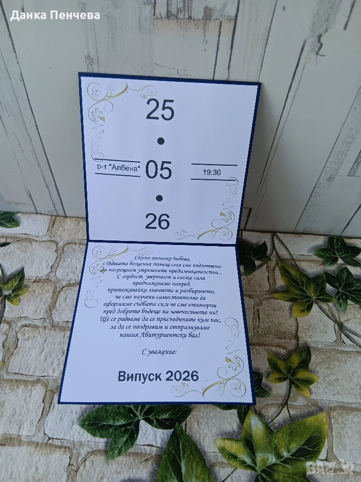 Цена до 50бр.-1.95€/ за бр. Цена над 50бр - 1.85€/за бр. В цената е включен и текст черен печат по Ваш избор. Минимално количество 10бр или 2.50€/ за бр. Поръчка под 20€ не се приемат! Ако желаете да персонализирате поканата + 0.20€/бр. пример:( Уважаеми г- н Борисов ) Може да се свържете с мен на Вайбър: 0899281168