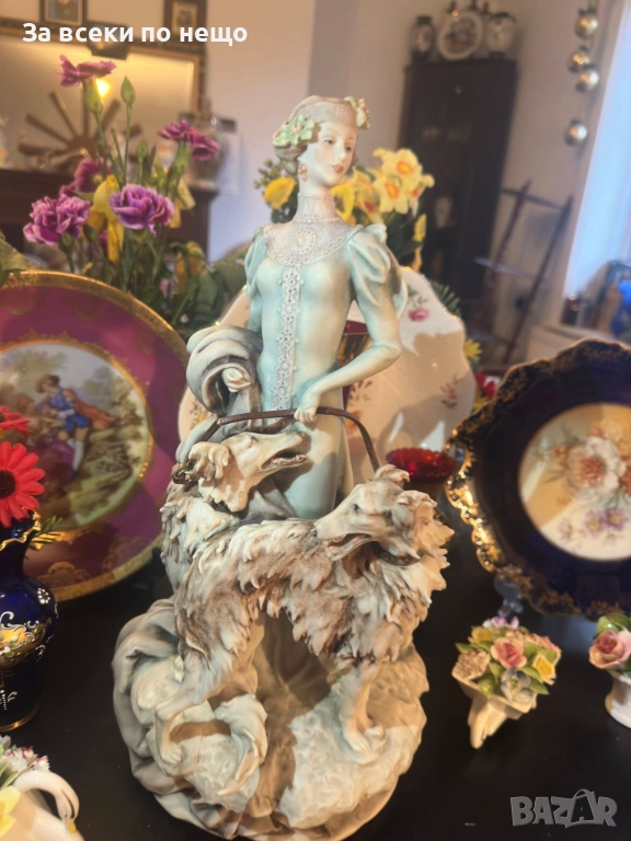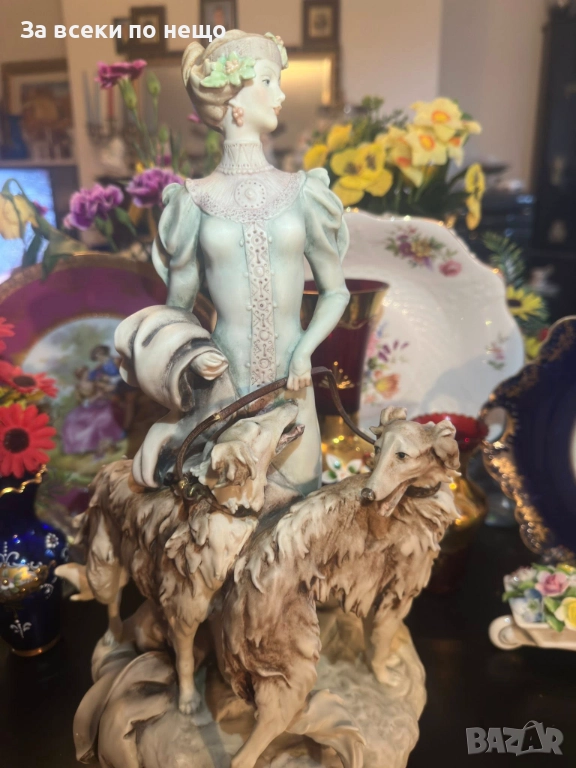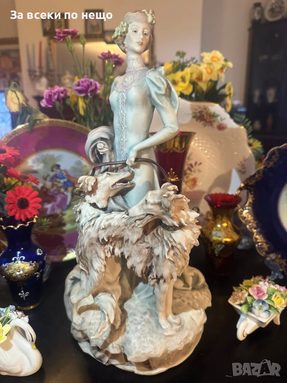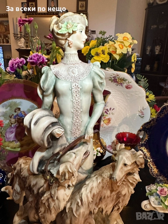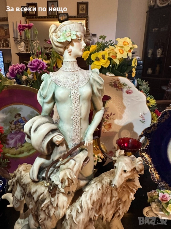 “Florence”Figurine Lady With Greyhounds - невероятна композиция на красавица с две хрътки, 38 см великолепие и класа от най-добрия италиански художник на 20 век. Очарователна визия за тежък салон, хол или офис, отлично качество и състояние, грандиозна скулптура без аналог!