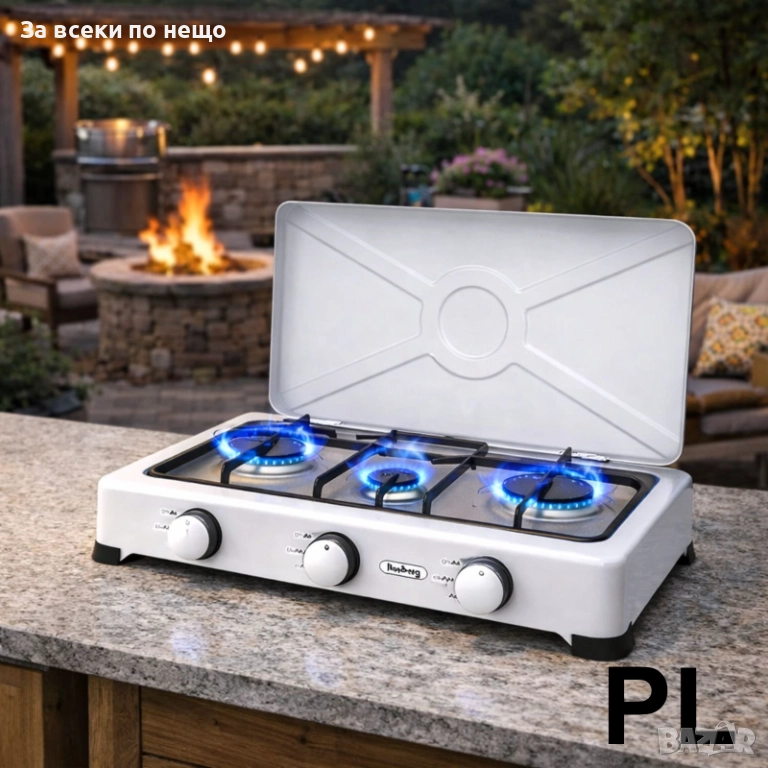 Газовият котлон е изработен с боядисан панел от въглеродна стомана и разполага с 3 горелки от лят алуминий с емайлирани капачки, които осигуряват по-добър пламък и по-бързо готвене. Металната скара гарантира стабилност на съдовете, а компактните размери 60 × 33 × 9 см го правят удобен за използване на открито и в проветриви пространства.