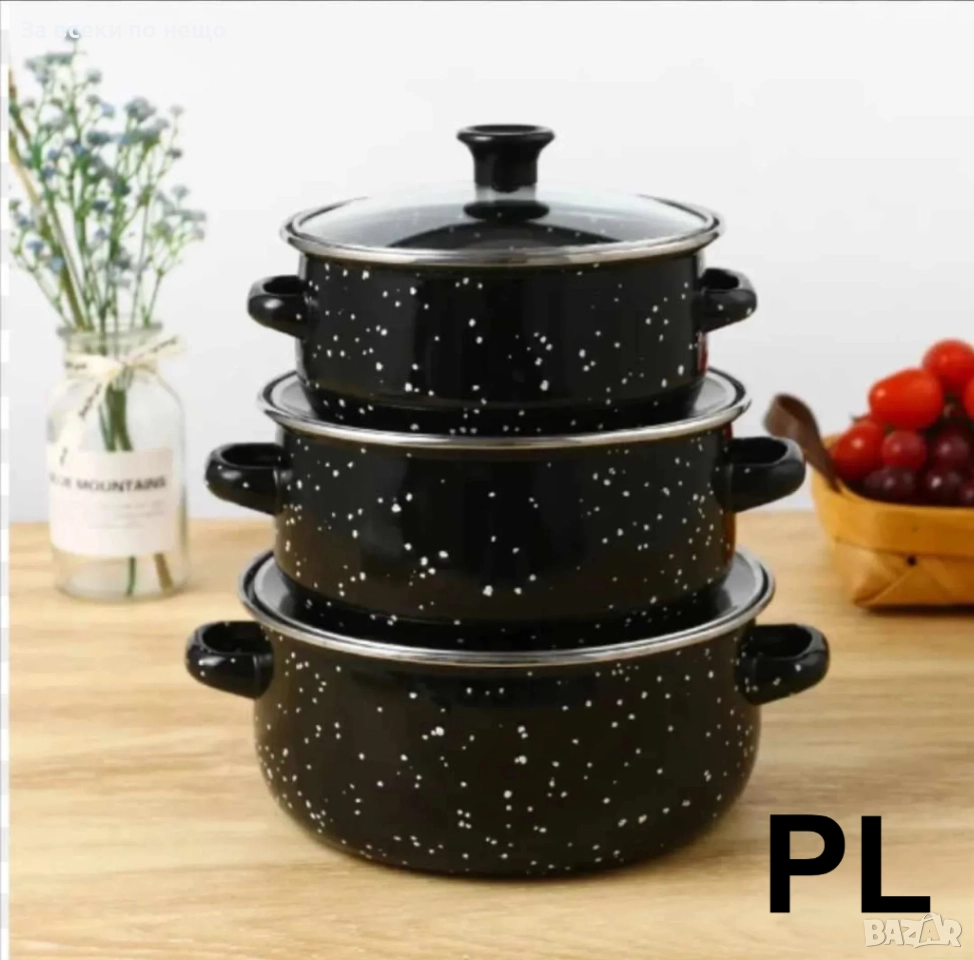 Комплект 3 емайлирани тенджери със стъклени капаци
