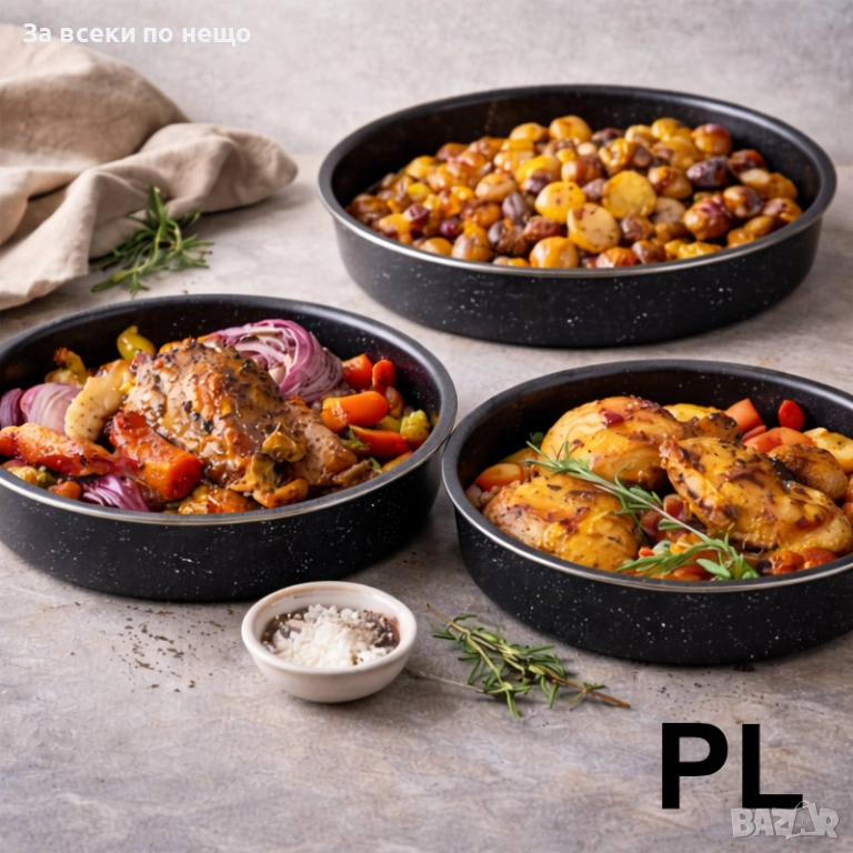 Комплектът тави за печене Rosberg R51222MR244 включва 3 дълбоки тави с диаметър 24 см, 28 см и 30 см и дълбочина 5.5 см. Те са изработени от въглеродна стомана с мраморно незалепващо покритие, което осигурява равномерно изпичане без залепване. Тавите са лесни за почистване, подходящи за съдомиялна машина, екологично чисти и без PFOA, което ги прави отличен избор за печене на месо, зеленчуци, тестени изделия и сладкиши.