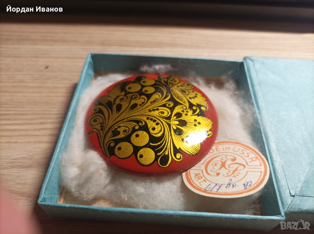 Предлагам авторска брошка от СССР,дървена и ръчно рисувана,в оригиналната си кутия със запазени сертификат за произход, диаметър:6,5 см