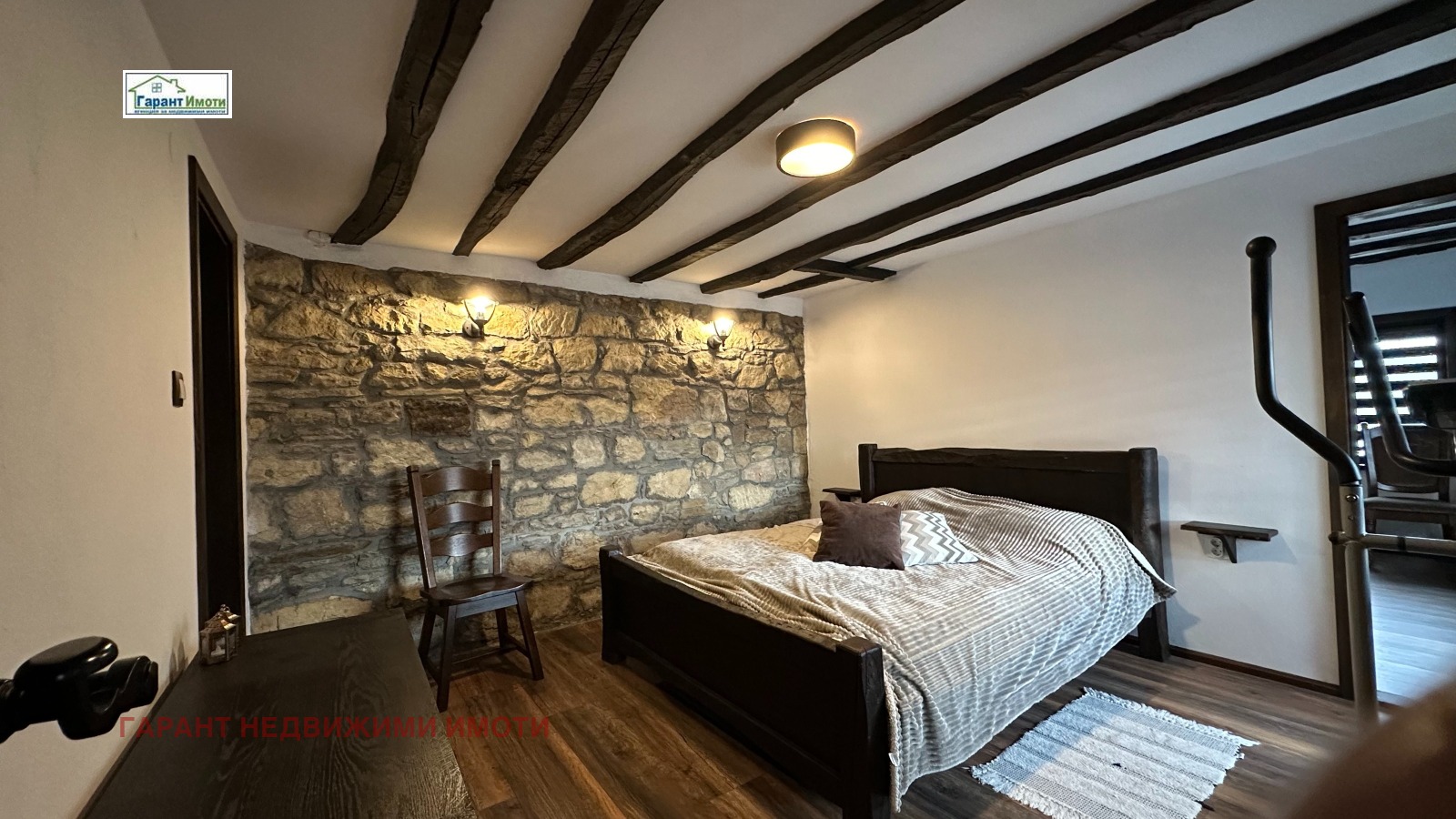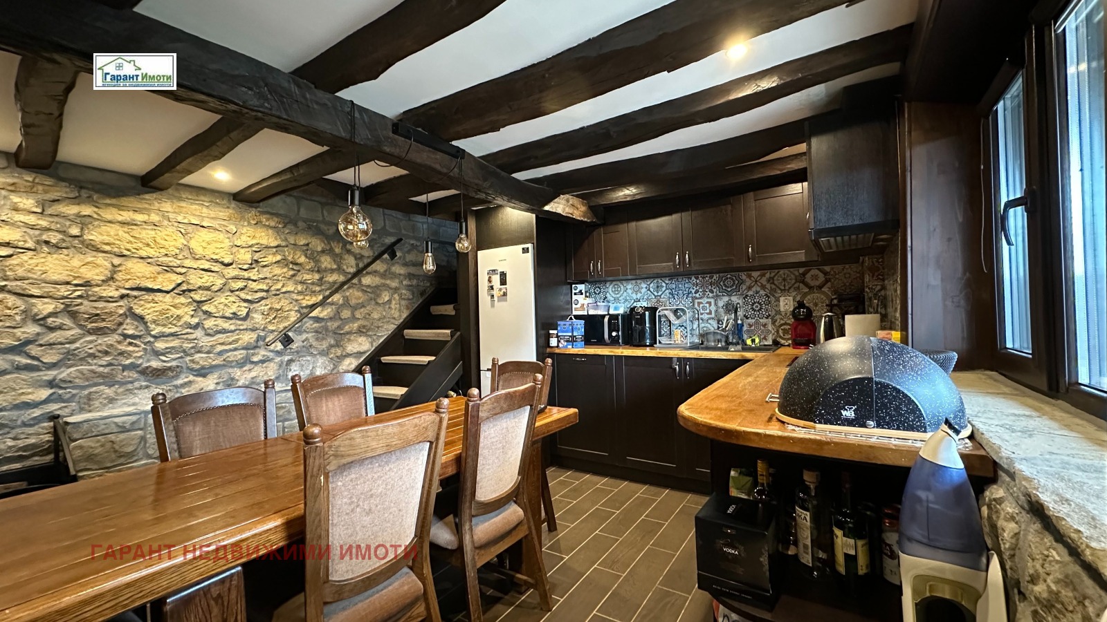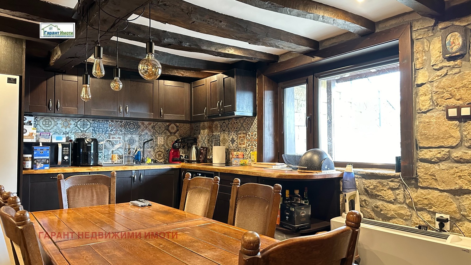 ГАРАНТ имоти продава къща с голямо дворно място на атрактивна локация само на 3 км от град Трявна. До имота се достига по изцяло асфалтов път с целогодишен достъп. В дворно място с площ 2343 кв.м са разположени изцяло реновирана двуетажна къща с пристройка във Възрожденски стил - обща площ 189 кв.м и две стопански постройки. На жилищната площ са разпределени голяма кухня-трапезария-дневна, четири спални, три бани с тоалетна, голяма тераса с панорамна гледка, сервизно, котелно, мокро помещение в едно. Извършен е цялостен ремонт - каменни основи, бетонна плоча между двата етажа, дренаж, външна топлоизолация 10 см, изолация на таваните с каменна вата, висококачествена PVC дограма, нови ВиК и ел. инсталации, монтиран е слънчев колектор за топла вода на покрива. Ръчно изработените парапети от ковано желязо и масивната портална врата допълват цялостния стил на имота. Отоплението е решено чрез пелетен котел и радиатори във всички стаи, като в трапезарията и спалнята на първия етаж има и подово отопление.
