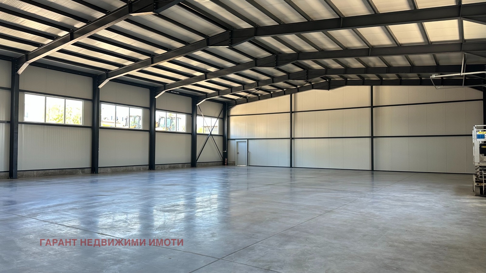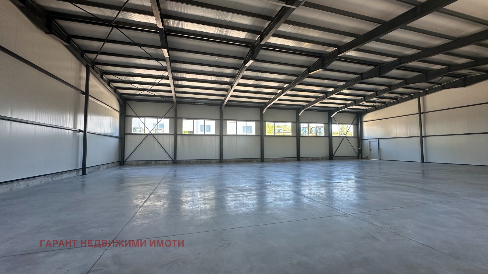 Имот 1 с площ от 640 кв.м разполага с три големи входни ролетни врати (единият достъп с рампа за бус) и два аварийни входа. Цена 5000 лв без ДДС.