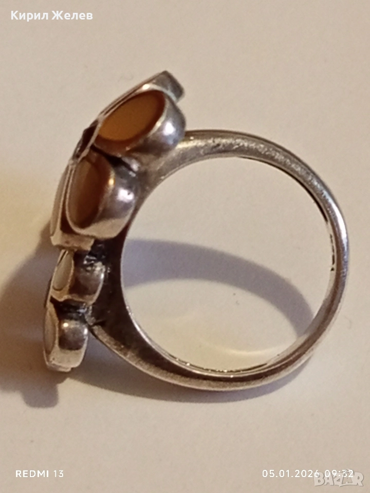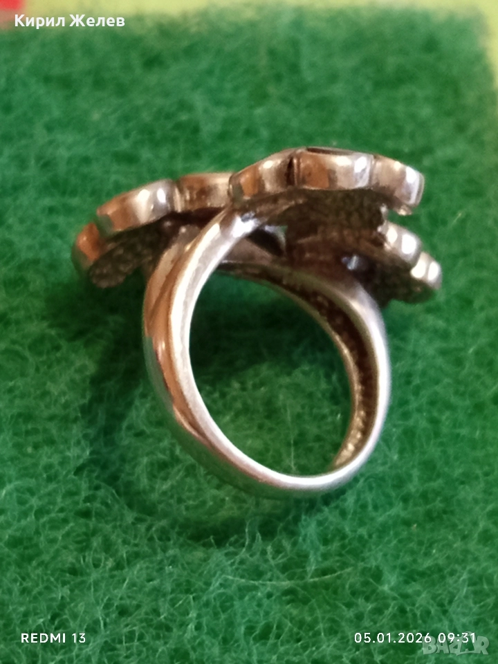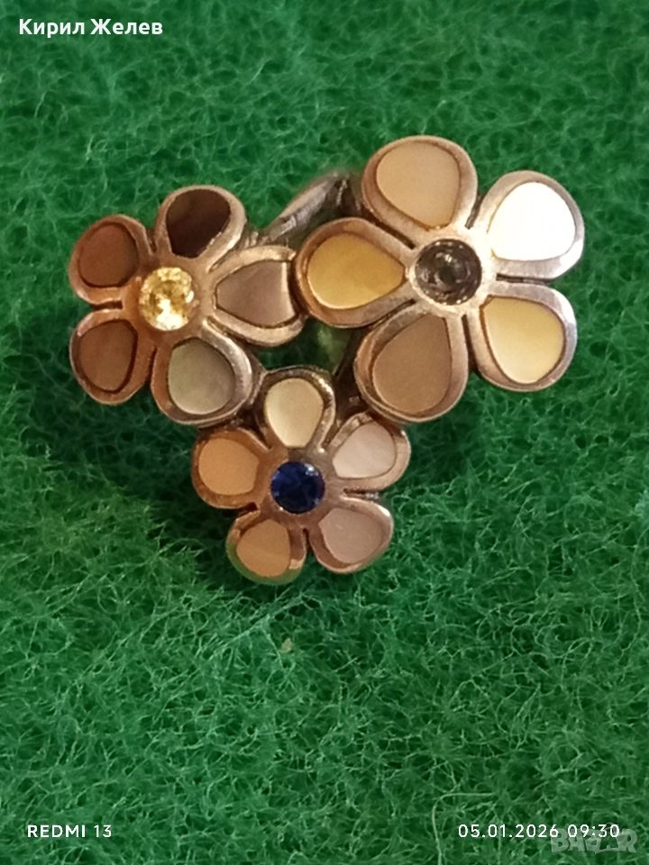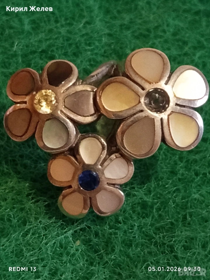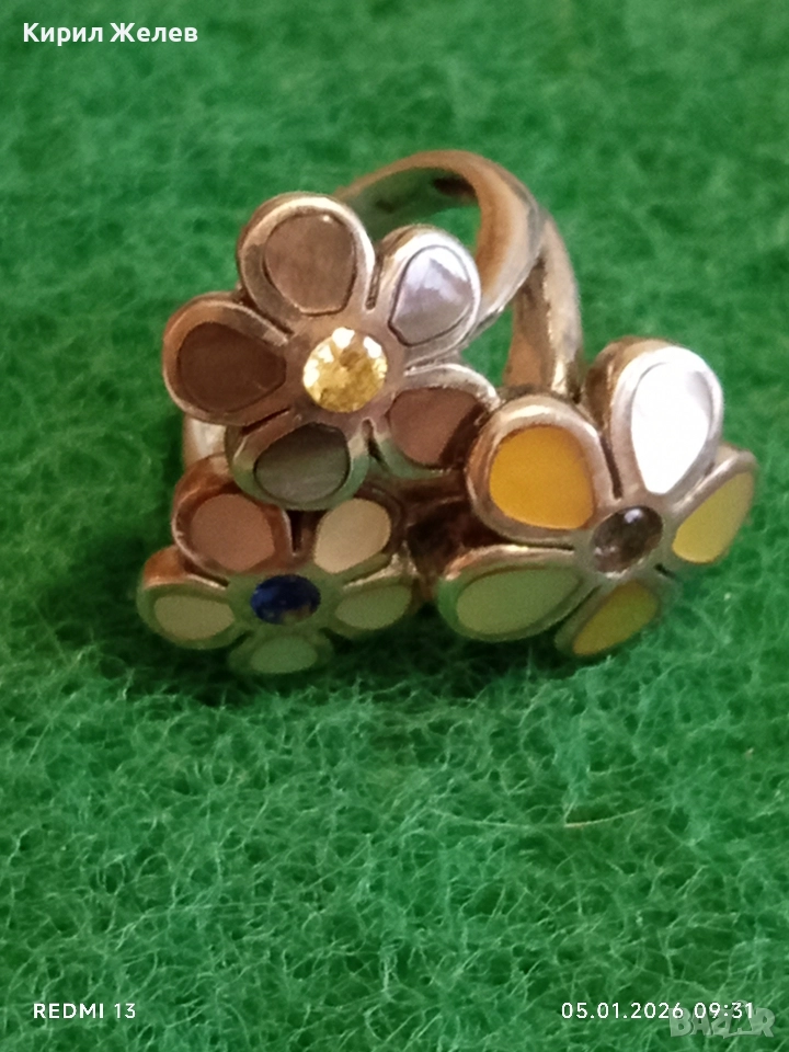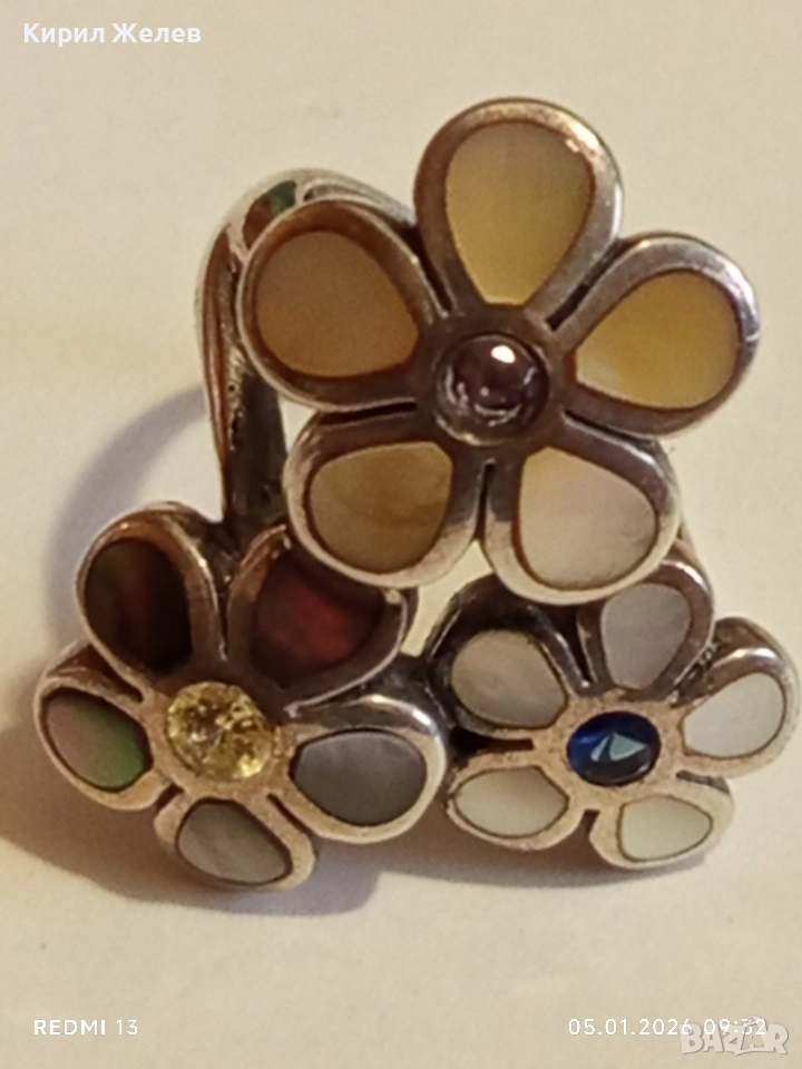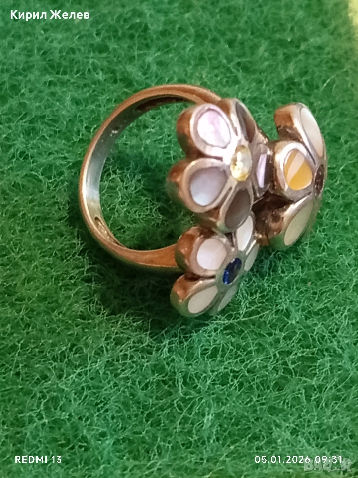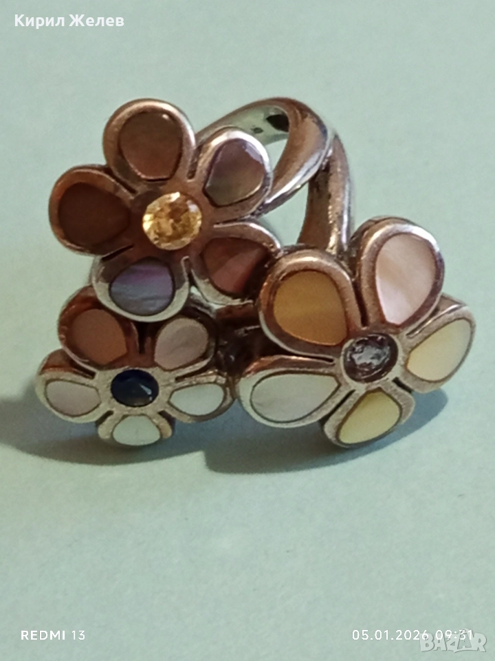 Артистичен сребърен пръстен венчелистчета с Кралски Седеф и кристали Арт бижу 19962