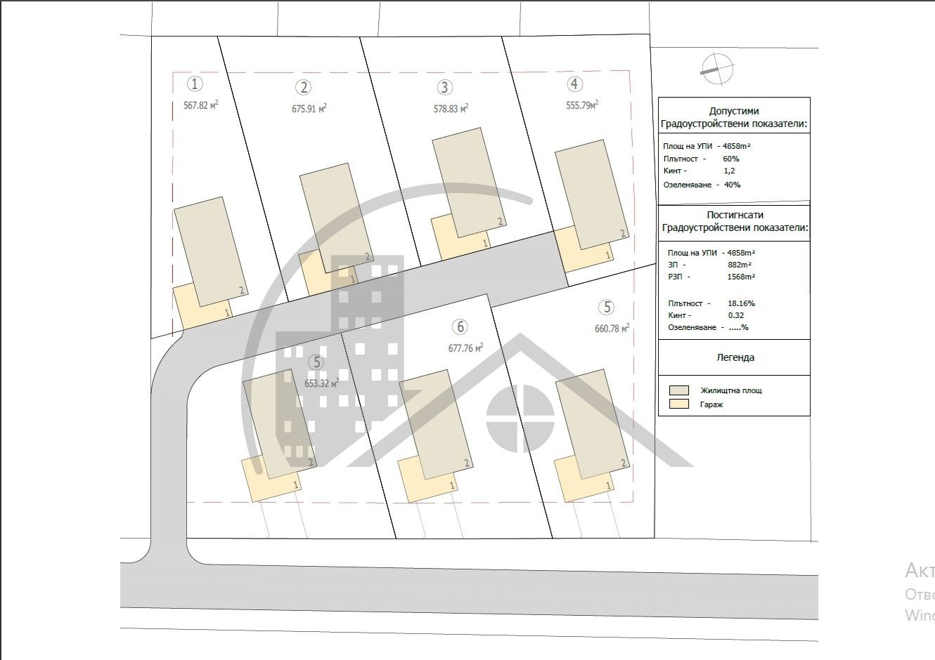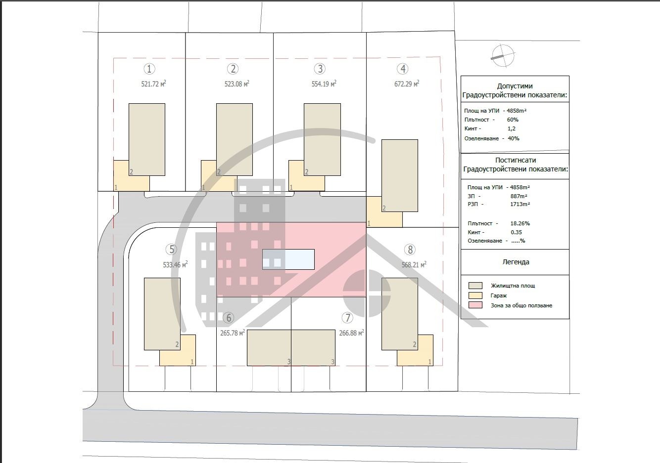 Към парцела предлагаме разбработени три варианта на идейни проекти за построяване на вилно селище с 7 или 9 едноетажни къщи със собствени гаражи, алеи, паркоместа, басейн и зелени площи около къщите.