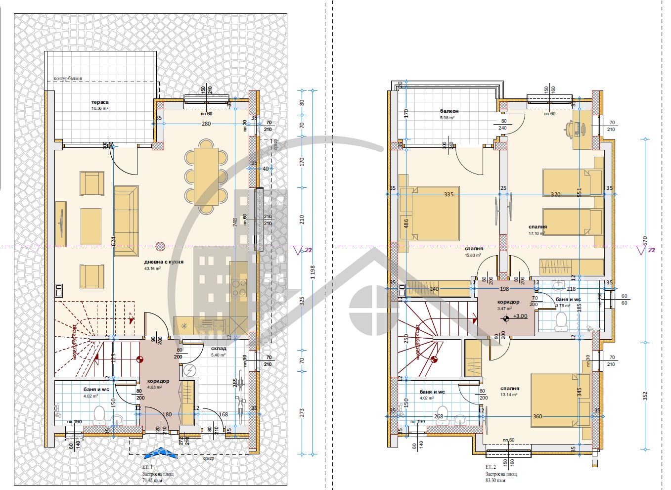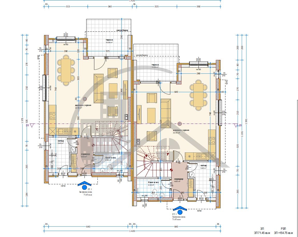 Етаж 1 (ЗП 71.45 кв.м) входно антре и стълбище, просторен дневен тракт с трапезария и кухня (43 кв.м) с излаз на веранда, склад и баня със санитарен възел.