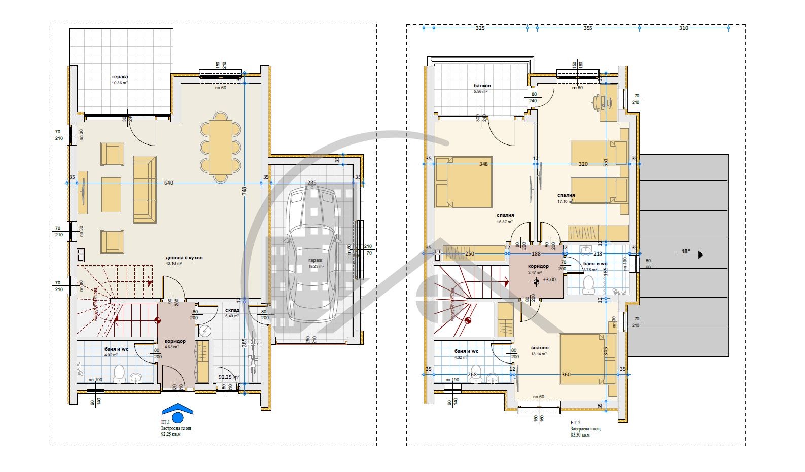 Етаж 2 (ЗП 83.30 кв.м) коридор, три непреходни спални (13, 16.40 и 17.10 кв.м) всяка с излаз на тераса, две бани, като едната е към родителската спалня.