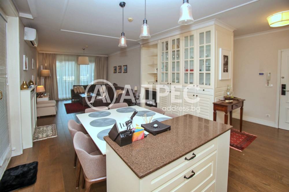 Обзавеждането е подбрано с вкус, съчетавайки модерни и артистични мебели, които създават приятна, топла и спокойна атмосфера. Жилището е с реална чиста площ от 80 кв.м и се намира в Maison Sofia - McGallery Collection.