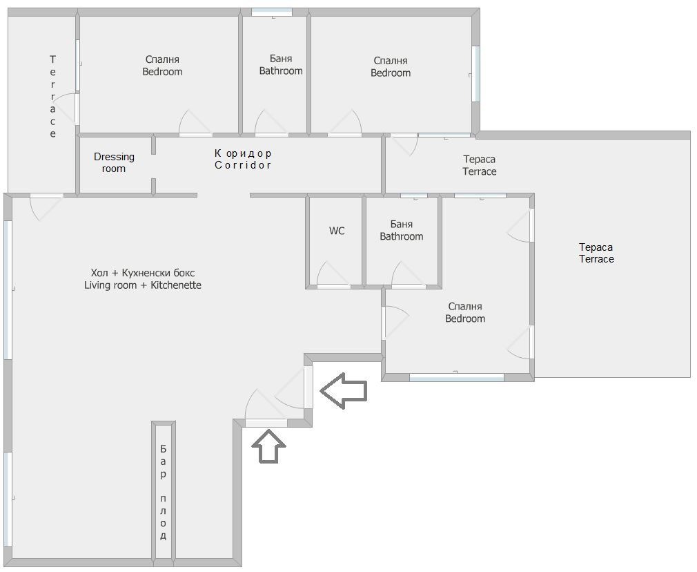 Състои се от дневна с трапезария и кухненски бокс, три спални, три санитарни възела и две тераси.
