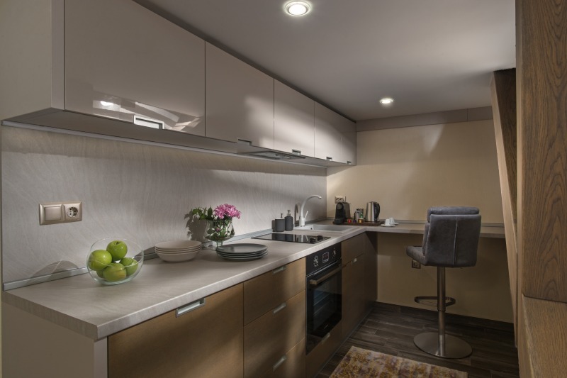 Всеки апартамент е напълно обзаведен и включва оборудвана кухня с хладилник, котлони, фурна, посуда и кафемашина Nespresso, удобен диван, Queen size спалня, смарт телевизор, високоскоростен интернет, климатик, сейф, ютия и дъска за гладене.