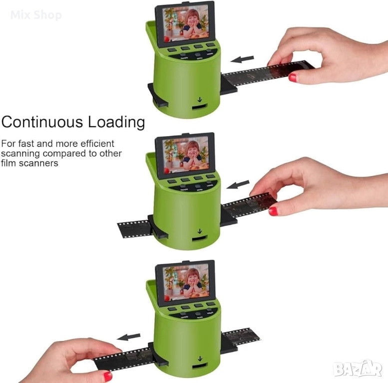Самостоятелен скенер за диапозитиви: Самостоятелен и не изисква компютър или софтуер, накланящ се 3,5-инчов цветен TFT LCD екран, лесен за използване и удобно регулиране на резолюцията на сканиране, яркостта и цветовете.