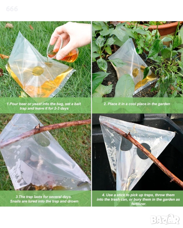 Лесен за употреба: подобрете грижата за градината си с нашите капани за охлюви тип „бира“. Нашият продукт е лесен за употреба, доставка и приложение и не изисква сложни настройки. Поддържането на градината чиста никога не е било толкова лесно.