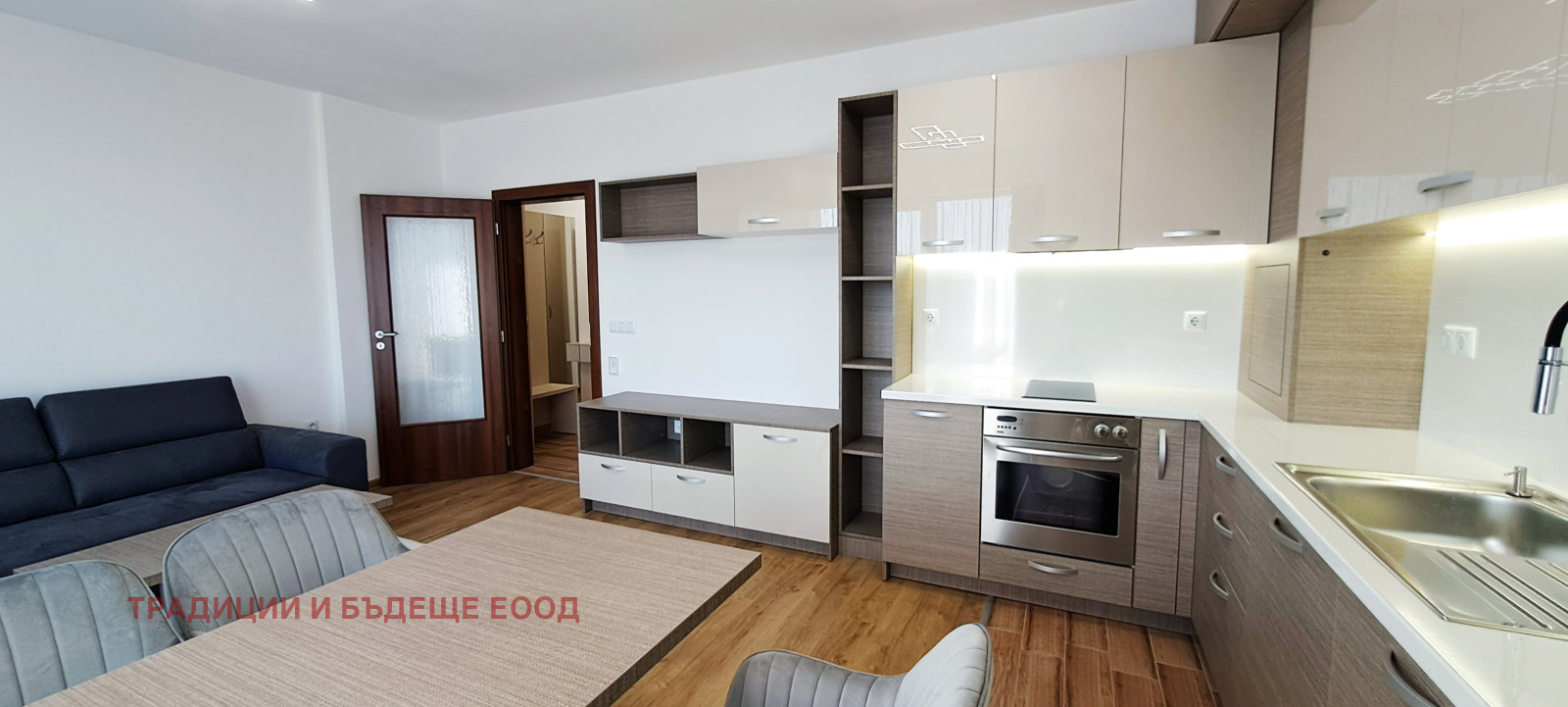 Апартаментът е съвсем нов, обзаведен по дизайнерски проект, съчетаващ топли меки цветове за спокойна атмосфера и комфортни мебели до най-малкия детайл. Оборудван със всичко необходимо за живеене. В кухненския кът има хладилник, вградена фурна и котлони, абсорбатор и съдомиялна, в коридора има мокро помещение с пералня и сушилня.