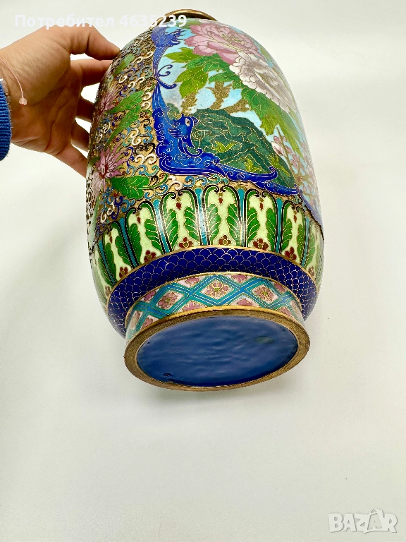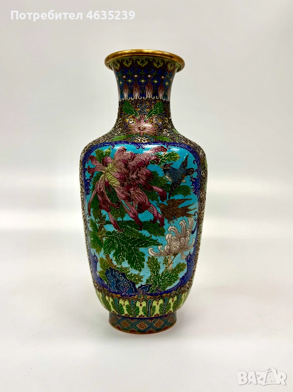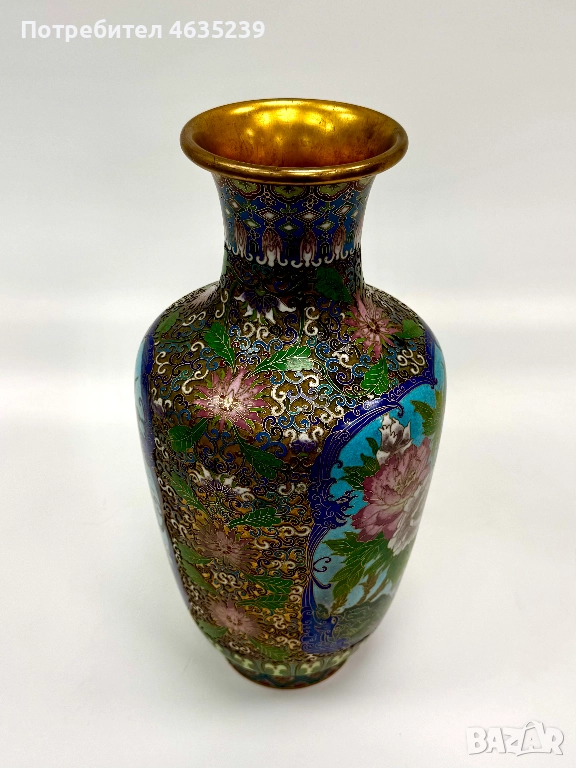 Впечатляваща ваза в техника клуазоне (cloisonné) с ръчно положен цветен емайл върху метална основа.
