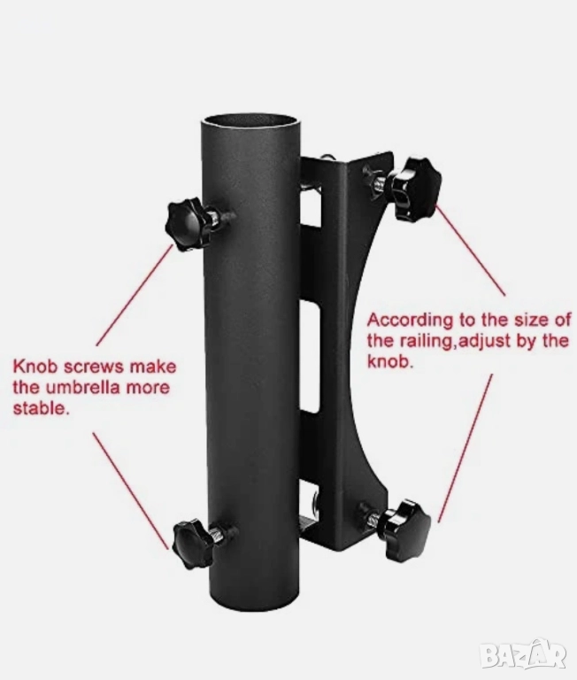 ШИРОКА УПОТРЕБА - Големият отвор на скобата може да се закачи навсякъде, където пожелаете, към трибуни, пейки, задни врати, стълбове, лодки, огради и други. ПОДХОДЯЩ - Уредът е подходящ за стълбове за чадъри с диаметър по-голям от 3,1 см и по-малък от 4,9 см.