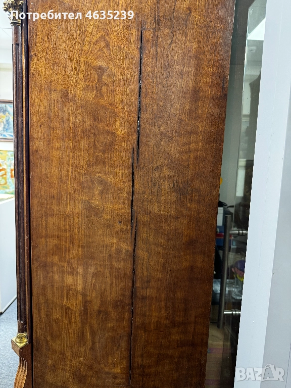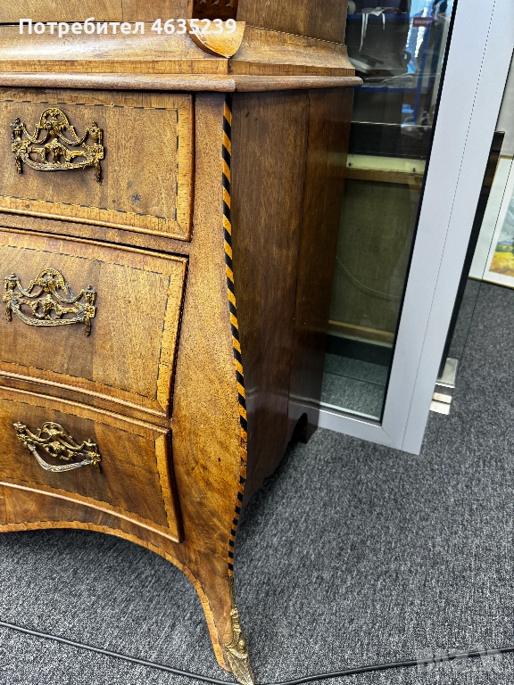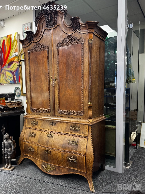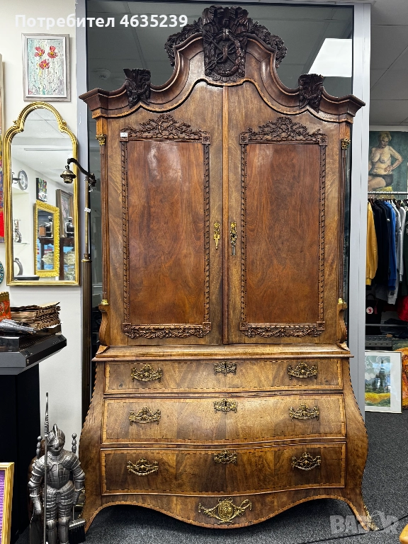 Впечатляващ антикварен секретер от масивно дърво, изработен с изключително внимание към детайла. Мебелът комбинира горна част с врати и долна част с чекмеджета, оформени с фина ръчна дърворезба, класически извивки и елегантни месингови дръжки.
