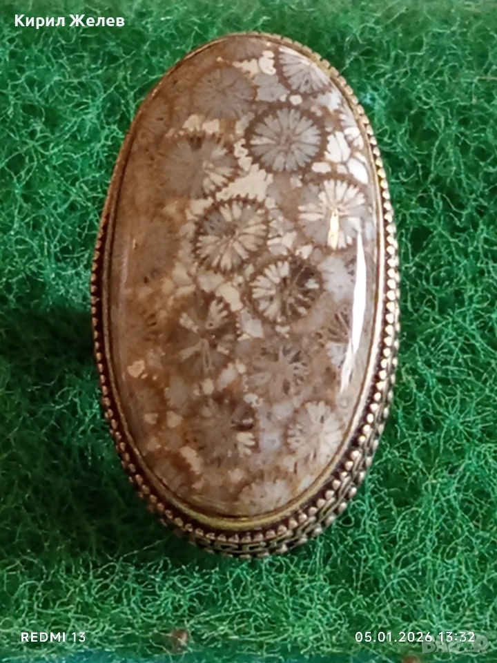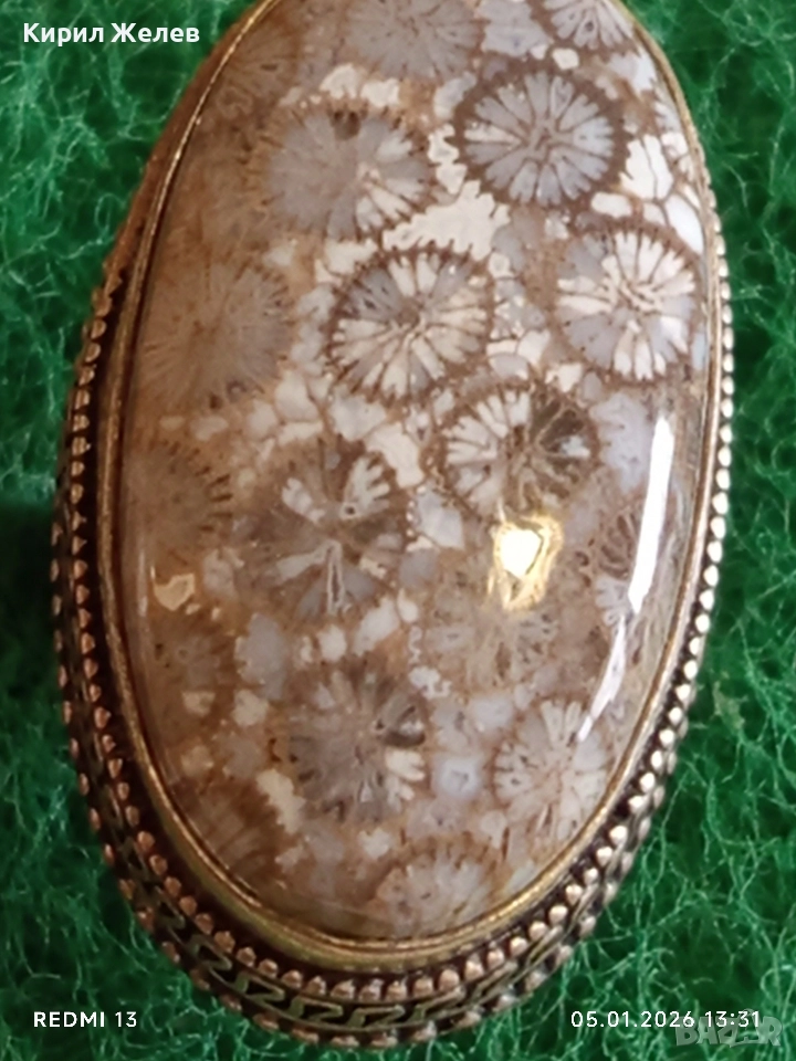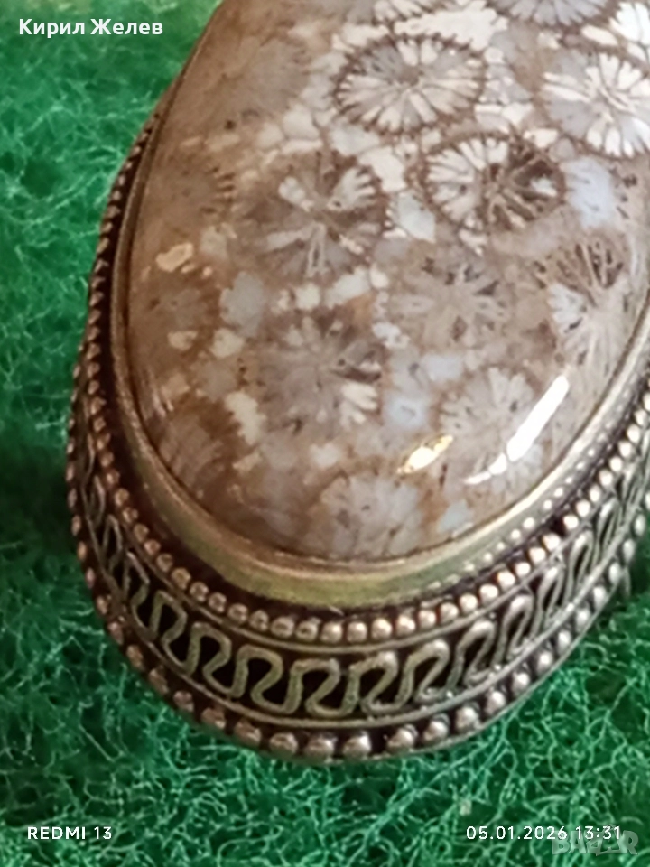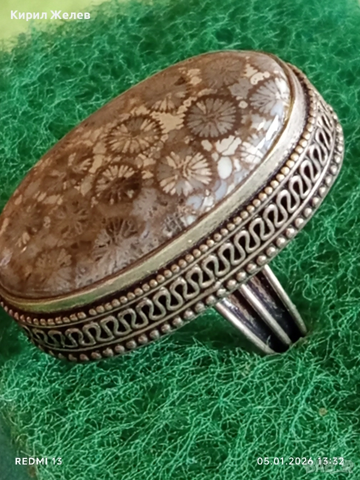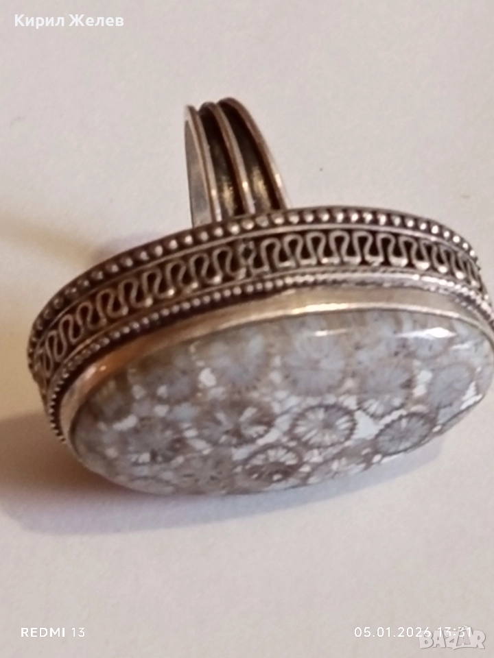Сребърен пръстен с инкрустиран вкаменен корал филигранна изработка уникален 51824