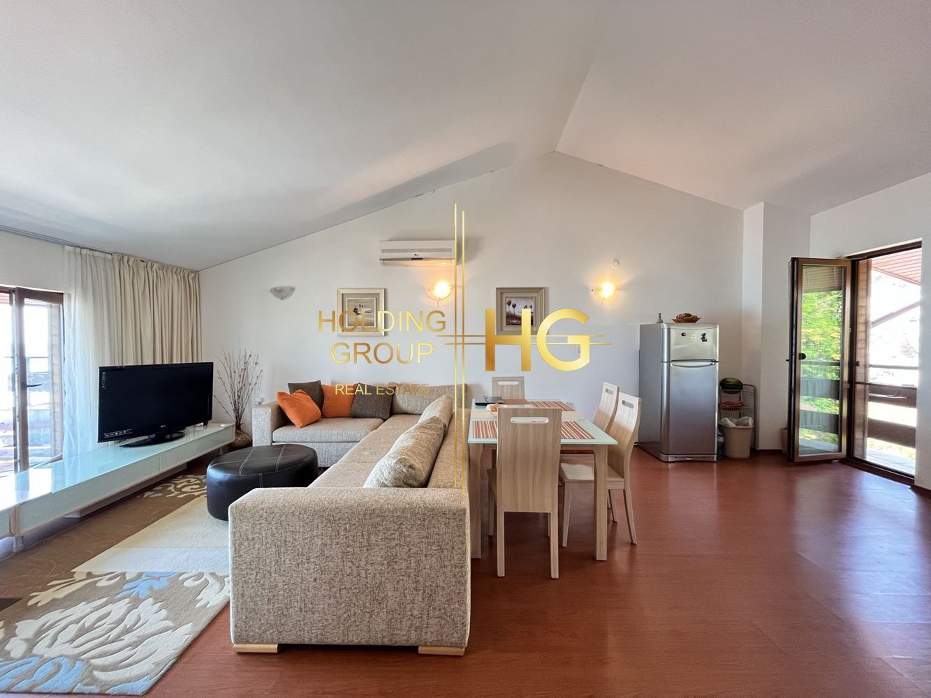 Състои се от: входно антре, дневна с трапезария и кухненски бокс с излаз на тераса, тоалетна, две спални, комбиниран санитарен възел, маза. Апартаментът се продава напълно обзаведен и оборудван. Към имота има и гараж!