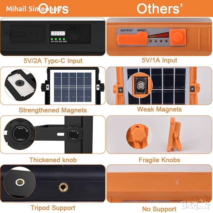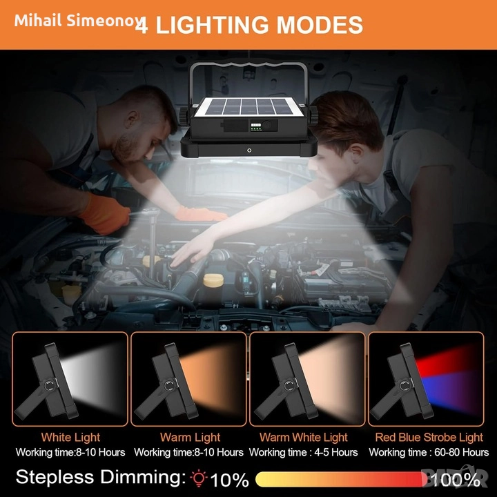 - [Водоустойчив IP66] Строителната лампа може да се използва като външна батерия, зареждайки електронни устройства (като телефони, таблети и безброй устройства) чрез микро USB входа. Водоустойчив IP66, позволява използване в дъждовни дни и предпазва строителната лампа от ежедневни водни пръски. Портът за зареждане също има силиконов капак за спокойствие.