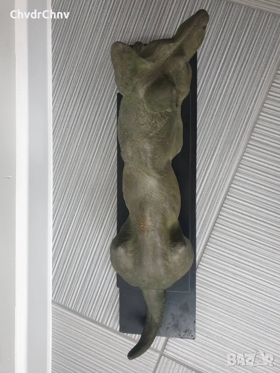 Дължина 51 см, височина 29 см, размери на основата 50х13х2 см (черен мрамор, истински, не е композит), тежи около 9-10 кг, изобразява немска овчарка (прилича и на вълк).