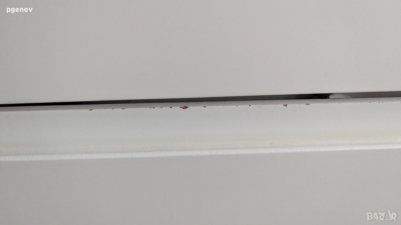 корпусът е от ПДЧ, а лицата на чекмеджетата от МДФ. Има забележки по боята.