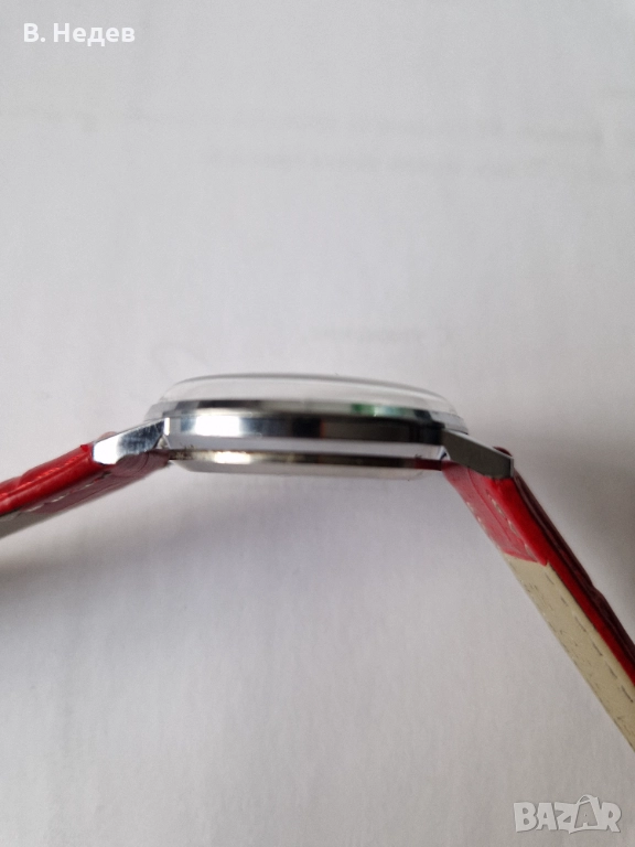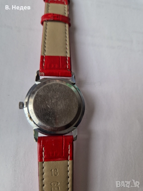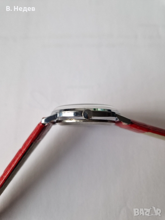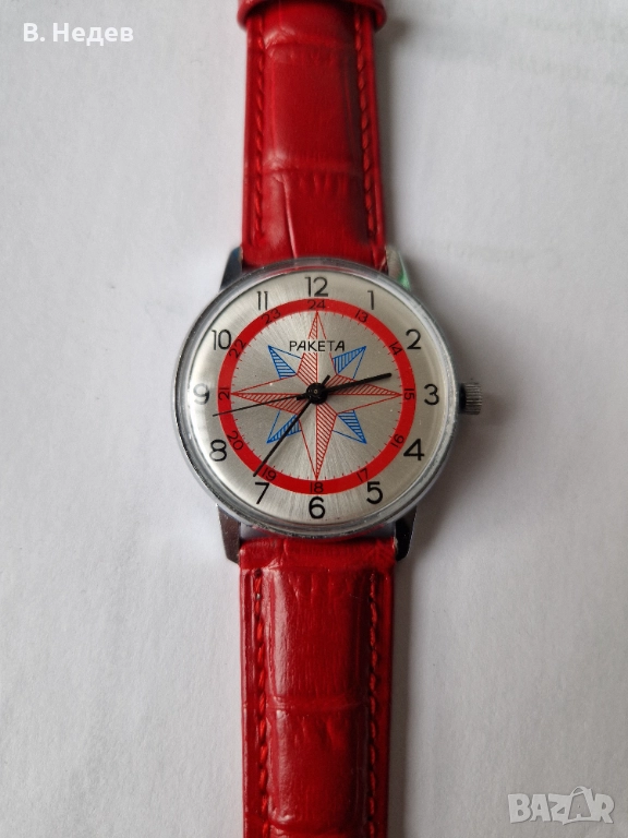 Продаваме този доста рядък руски /съветски/ часовник - мн. запазен! Ръчно навиване, отлично състояние - циферблат, индекси, стрелки, машина - моля разгледайте подробно снимките! Моля, обърнете внимание на детайлите на снимките! Часовника е т. нар. Ракета Компас или Ракета Азимут; с мн. качествена машина - базовия калибър "Ракета"2609 НА, с 19 рубинови камъка, противоударен прецизен баланс, централна секундарна стрелка, амортисьори на баланса и анкъра - действително противоударен часовник. Надеждна и безотказна машина, един от най-популярните калибри на ПЧЗ - Петродворцовия часови завод. Вибрации на баланса - 18000/час. Часовникът е след профилактика /но преди ок. 6-7 месеца/; поддържа точно време за механичен часовник – до +35-40sec/ 24 h. Запас на хода - около 44- 45 часа. Надписите върху циферблата: RАКЕТА. Часовника e с размери - 35,2 мм диаметър на корпуса, без коронката; от лъг до лъг - 41мм, височина 10,5мм. Арабски цифри на ЦБ - черни и черни стрелки, великолепна четимост!