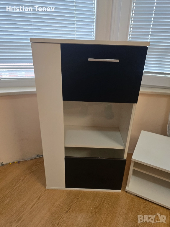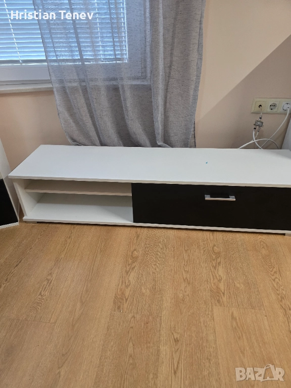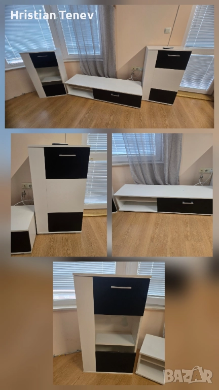 Тв секция от три части, две колони (широки 52см, дълбочина 31см и височина 96см) и една основна ниска с размер 145см широка, дълбока 39м и висока 30см. Нямат забележка