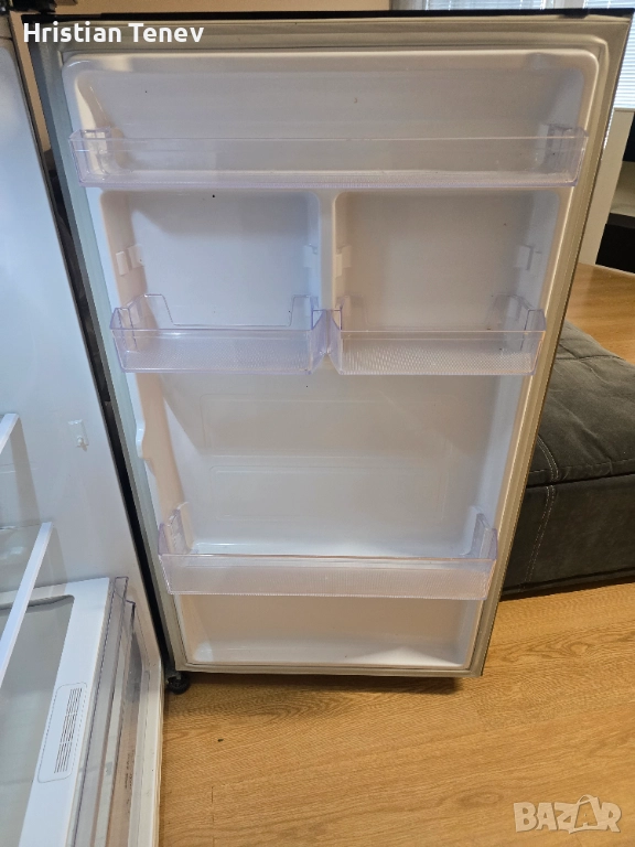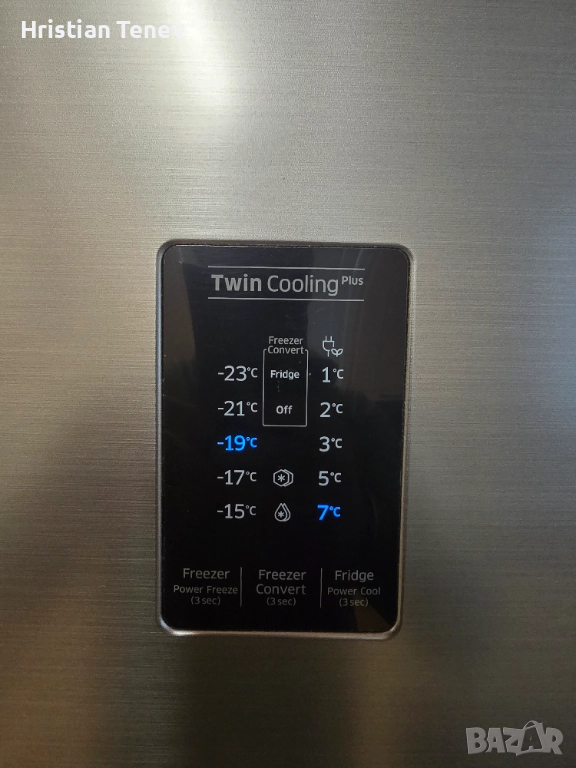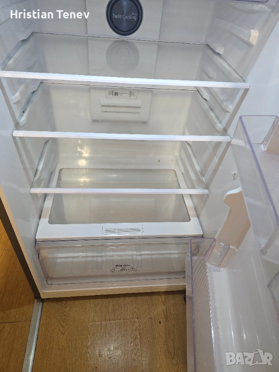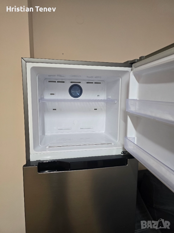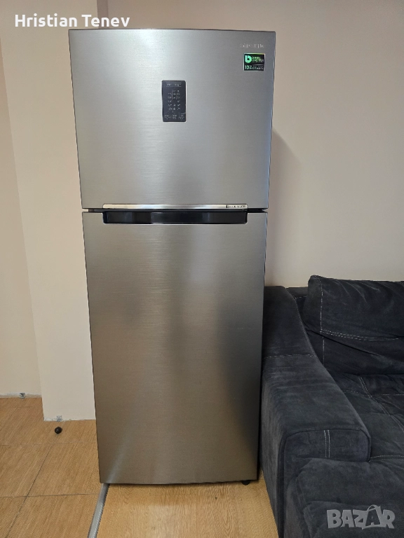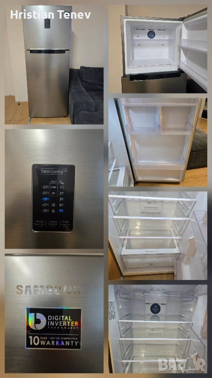Хладилник Samsung Twin Cooling Plus с инверторна технология, горна камера. Обема по спомен е 530 литра, 79-80 см широк и висок 185см. Работи тихо, надеждно и без никакви забележко... Инокс е на цвят. Всичко му фукнциора перфектно!