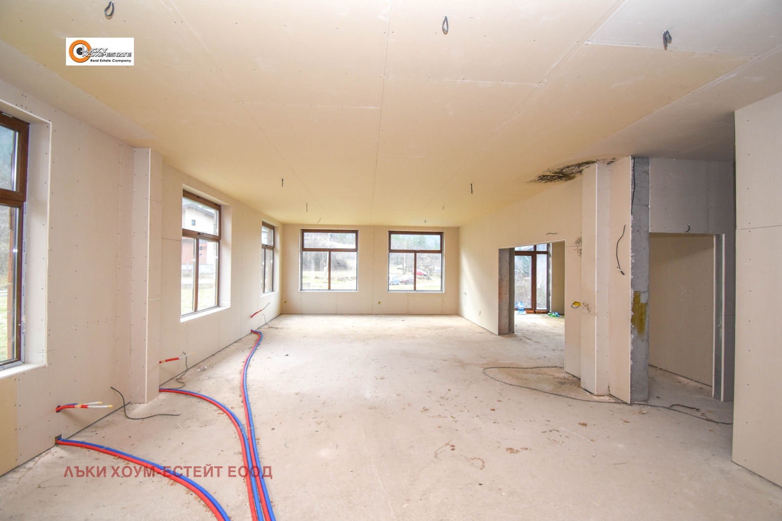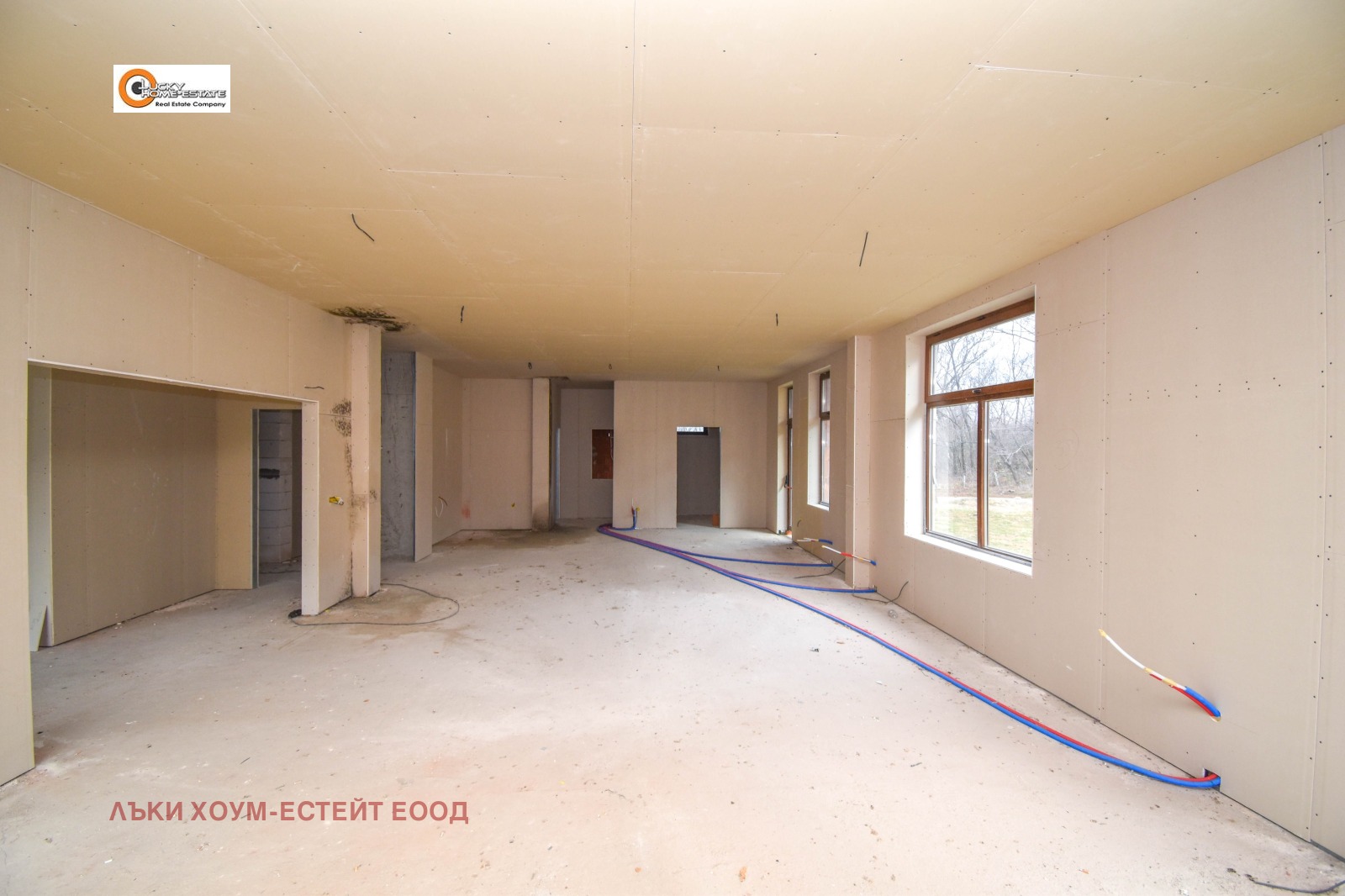 Сутерен: 280 кв. м. Изцяло отворено пространство с няколко прозореца, подходящо за помещаване на кухня, котелно помещение, перално помещение, склад или други обслужващи помещения.
