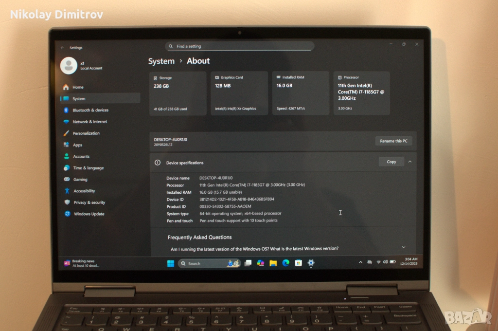 Лаптопът работи отлично без никакви технически проблеми, но има следи от употреба по корпуса които се виждат на снимките. Също така лаптопът се продава без зарядно (става всяко 60W зарядно USB Type-C) и му липсва писалката. Лаптопът е с инсталиран оригинален Windows 11 Pro.
