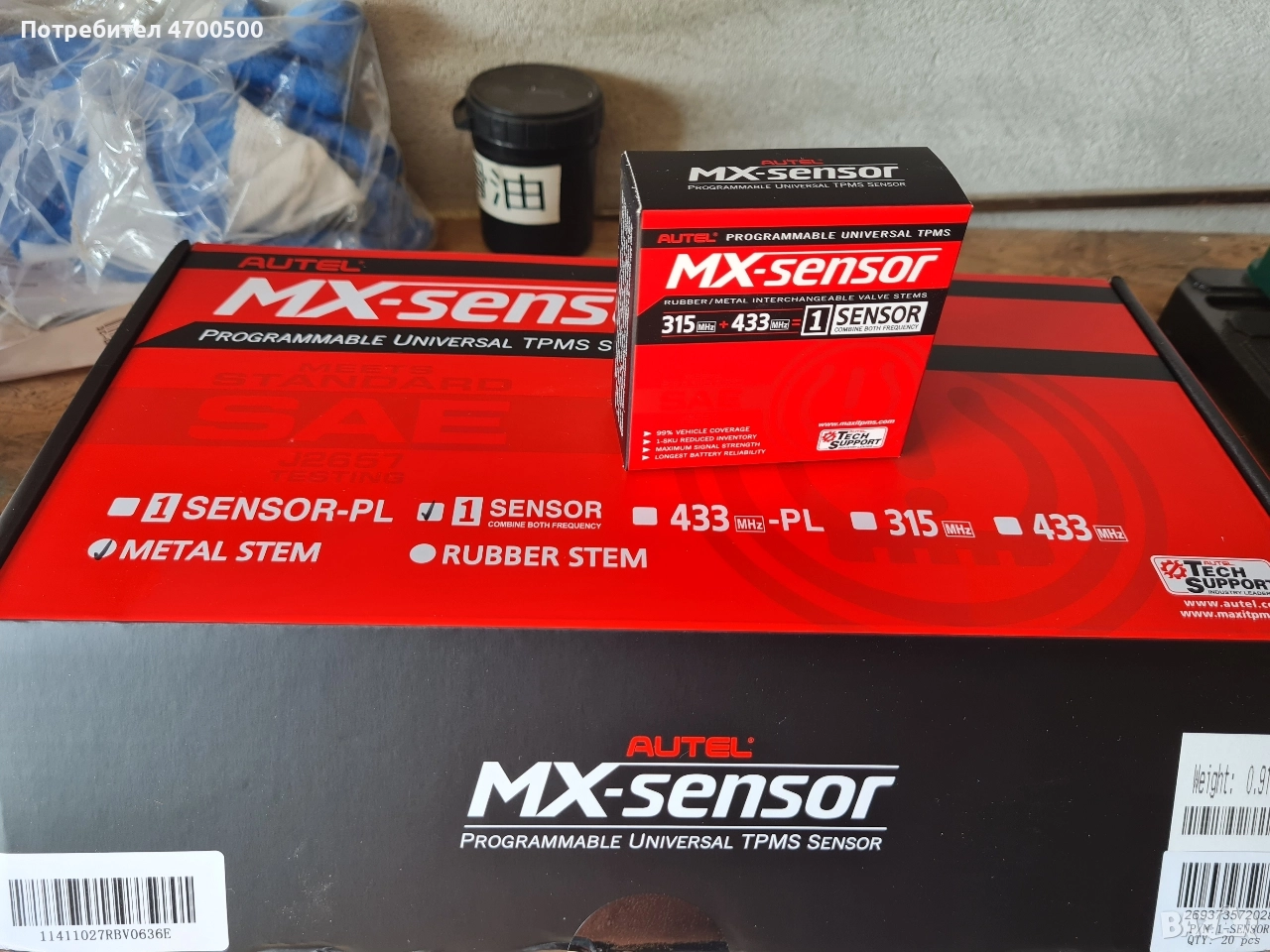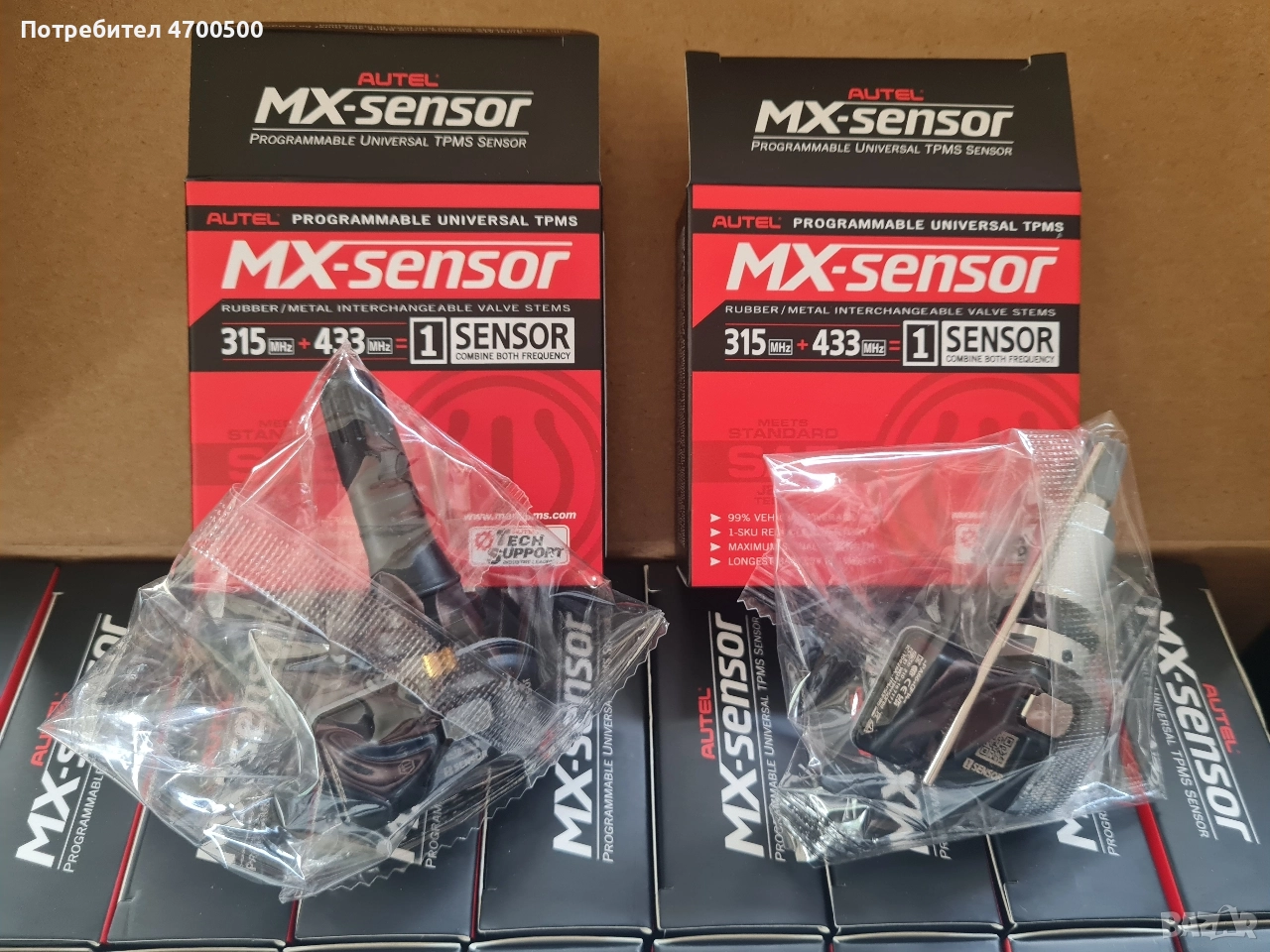 Autel MX sensor черен или сив Предлагаме чисто нови, най-висок клас TPMS/ТПМС универсални програмируеми сензори Autel MX – най-добрите на пазара, с подобрена батерия CR2450HR (550 mAh, 7-10 години живот) и по-силен сигнал за по-надеждна връзка с автомобила. Сензорите се програмират индивидуално за вашия автомобил. Гарантираме 100% съвместимост и готовност за монтаж. **Важно предимство:** Сензорът може да се препрограмира многократно, дори когато смените марката и модела на автомобила си. Това ви осигурява гъвкавост и дългосрочна инвестиция. **За информация и сравнение:** По-старият модел на Autel е с батерия CR2050HR с капацитет 350 mAh, която издържа около 5 години. * 315 MHz и 433 MHz * Живот на батерията: 7-10 години (CR2450HR, 550 mAh) * Работна температура: -60°C до +150°C * Точност на налягането: ±10 kPa * Налични винтили: метални