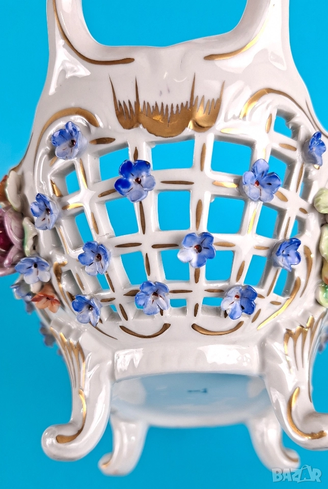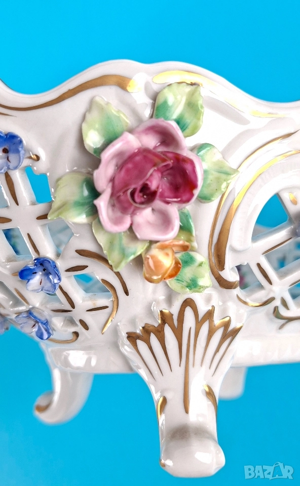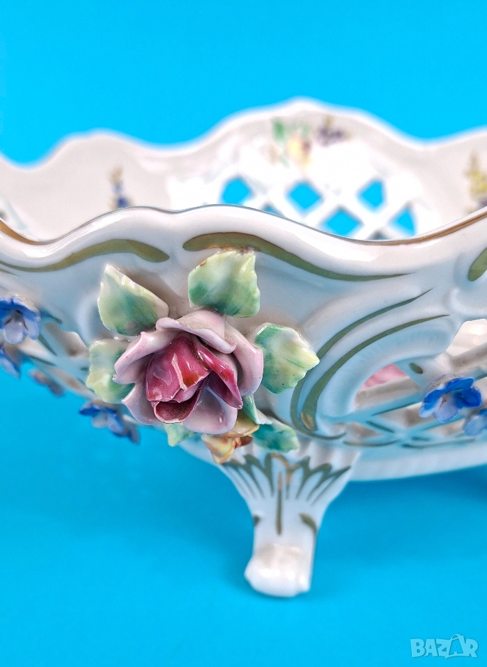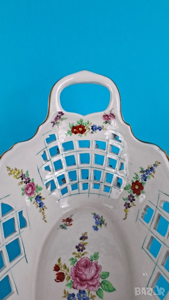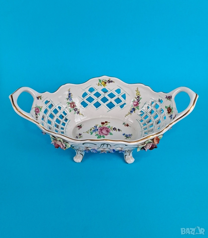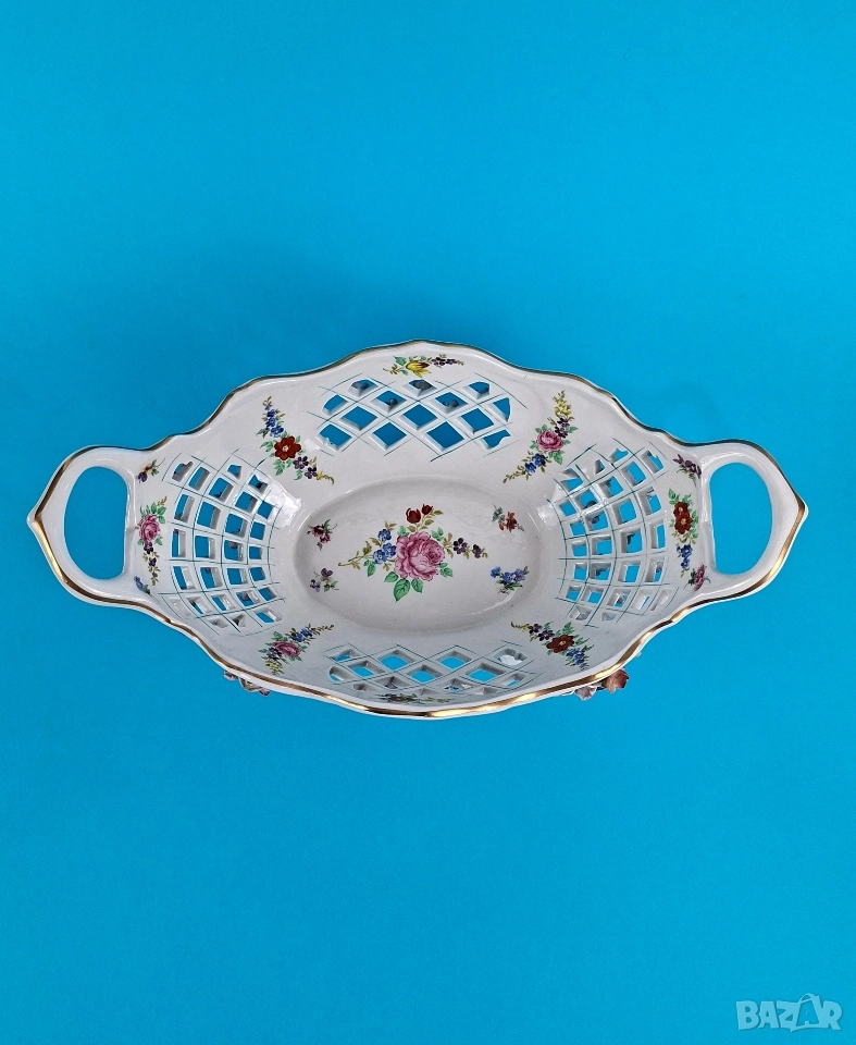 Ажурна фруктиера, ръчно декорирана с релефни цветя, фини златни акценти и изящни дръжки. Вътрешната страна е украсена с красиви цветни букети. Подходяща за център на маса или колекционерска витрина.