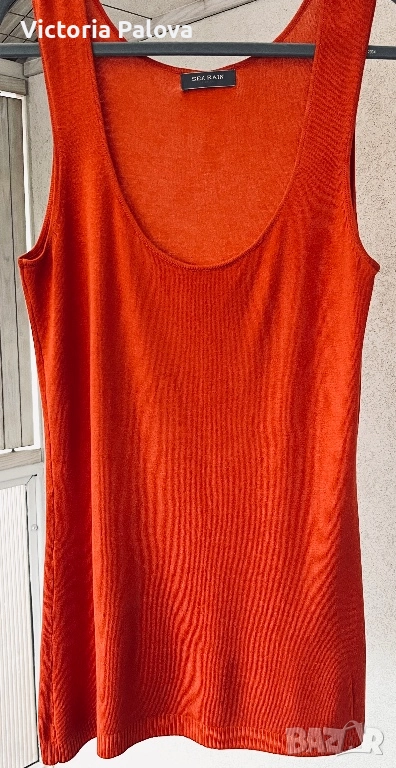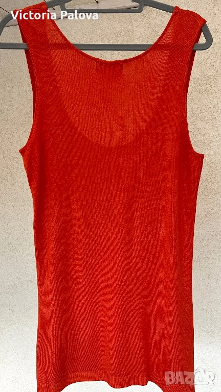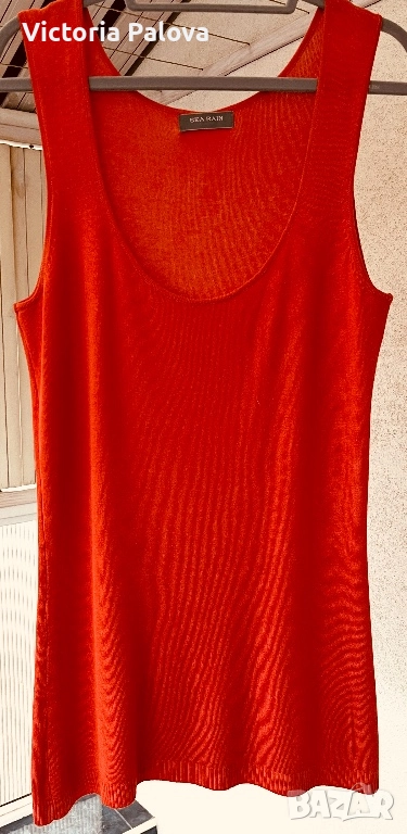 Стилен плетен потник от серия Sea Rain в богат оранжев нюанс. Материята е много гладка и нежна, с фин гланц и леко “тежащо” падане, напомнящо на коприна или органичен памук. Точно този ефект придава усещане за лукс. Стои меко по тялото, не прозира и потвърждава усещане за премиум качество. Класическата линия го прави универсален - подходящ за ежедневие и за елегантни комбинации под сако или жилетка. Това е семпъл, но луксозен потник за хора с вкус към изчистения стил. ГО - 48см, дължина - 75см.